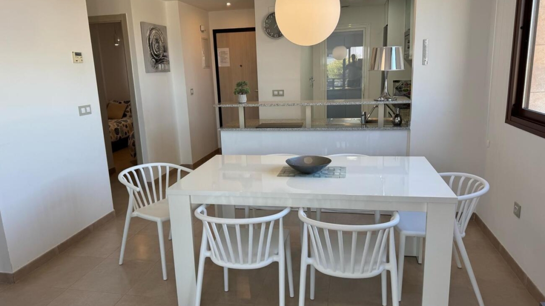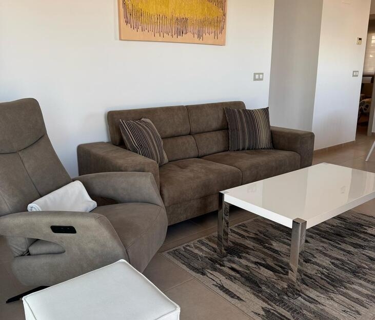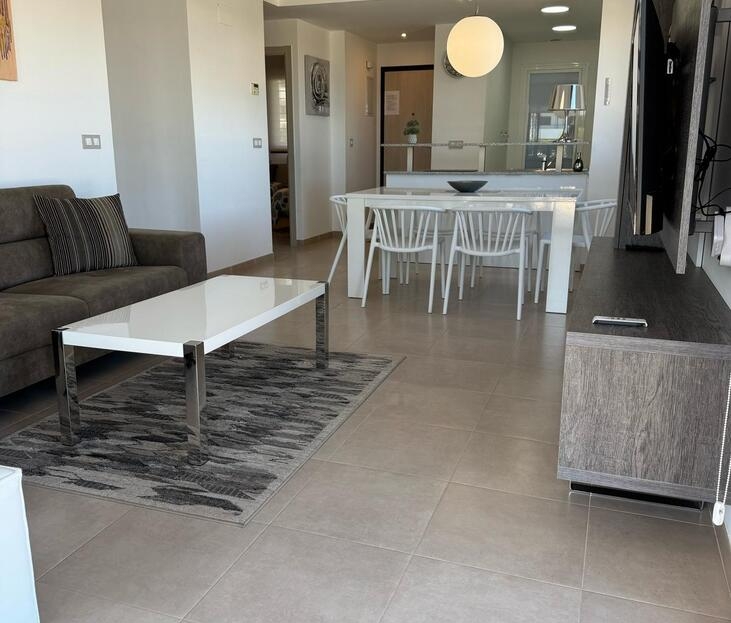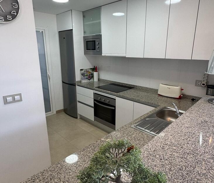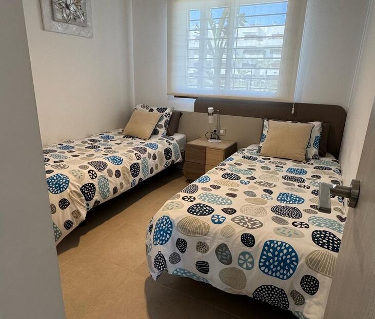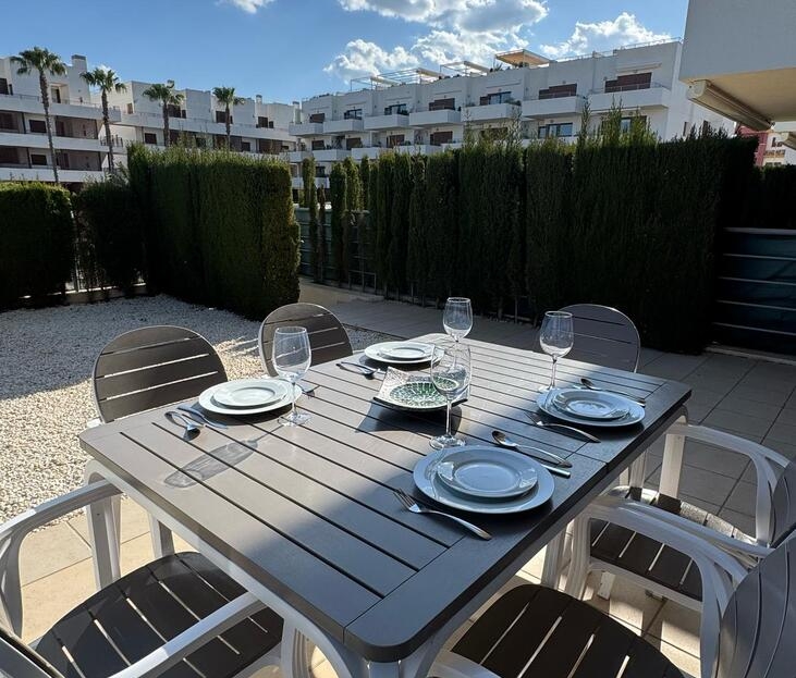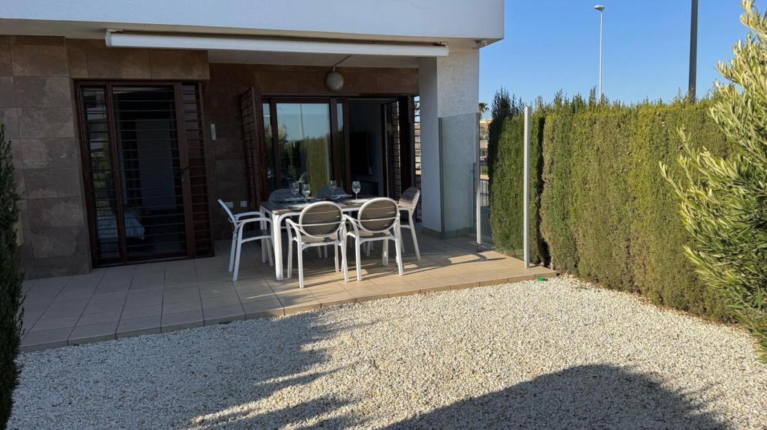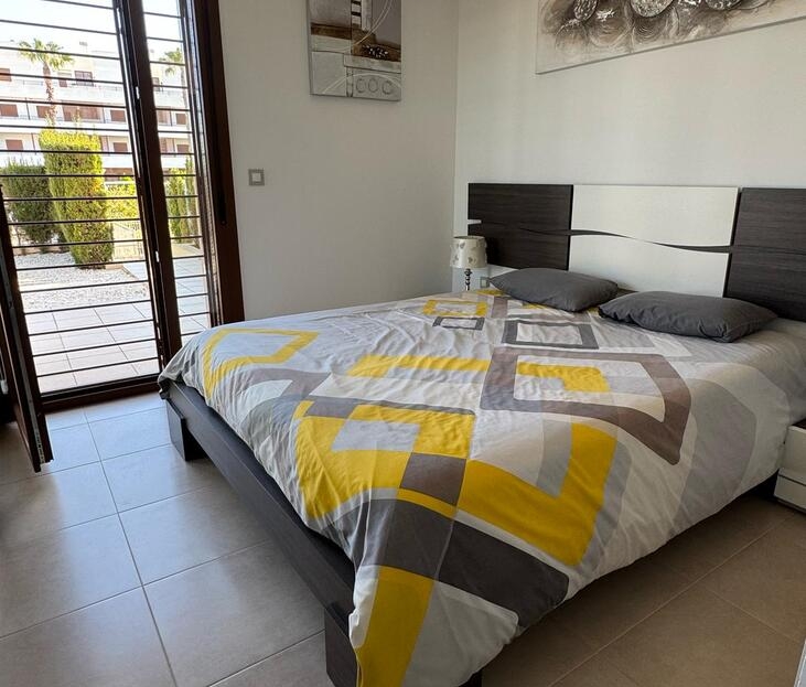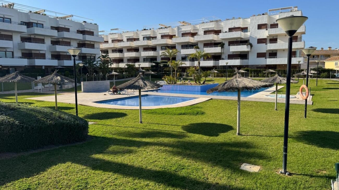 Beautifully maintained ground floor apartment with 2 bedrooms and 2 bathrooms in the Lomas de Cabo Roig area. This ready-to-move-in corner apartment is ideal for those looking for comfort, space and a wonderful Mediterranean lifestyle.Thanks to the corner location, you can enjoy extra light and more privacy.Fully south-facing, sun canopy and airco available and underground spacious parking space just below the apartment.Located in a beautifully landscaped and well-maintained residential complex with two communal swimming pools and beautiful gardens.The area is quiet, yet close to all amenities. It is centrally located in the heart of Playa Flamenca with only a short walk to two lovely beaches, a supermarket, bakery, pharmacy and plenty of restaurants. In addition, it is only a five-minute walk to the popular Saturday market and the famous Zenia Boulevard shopping centre.