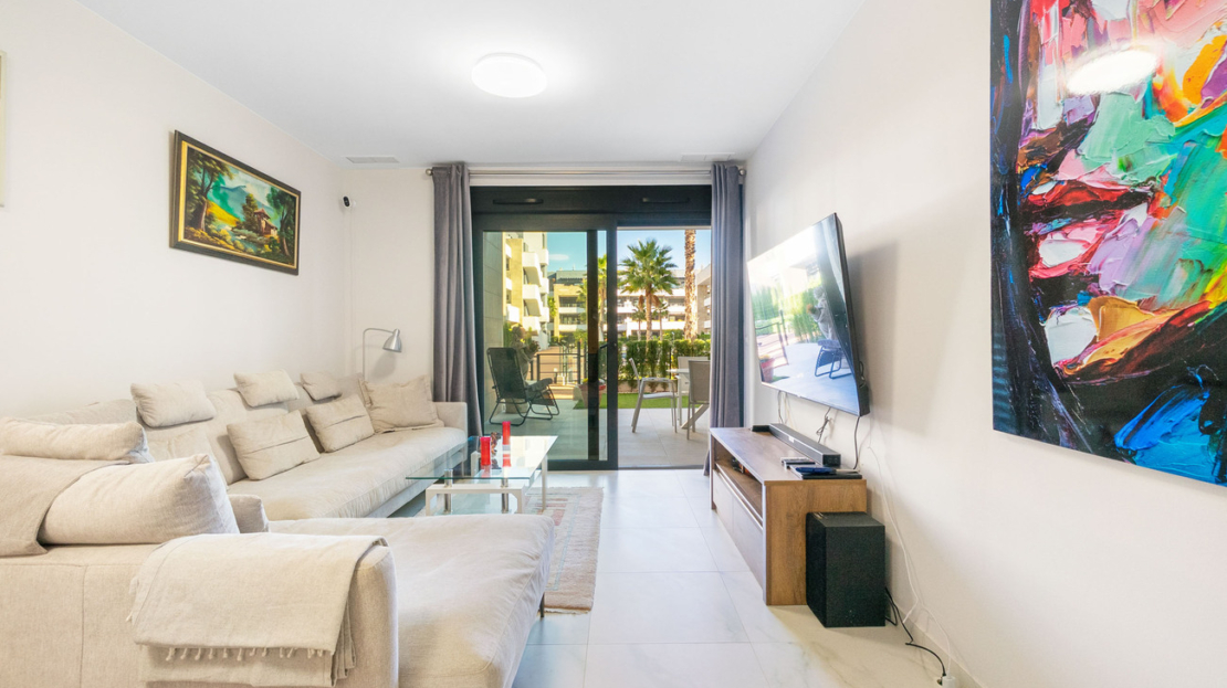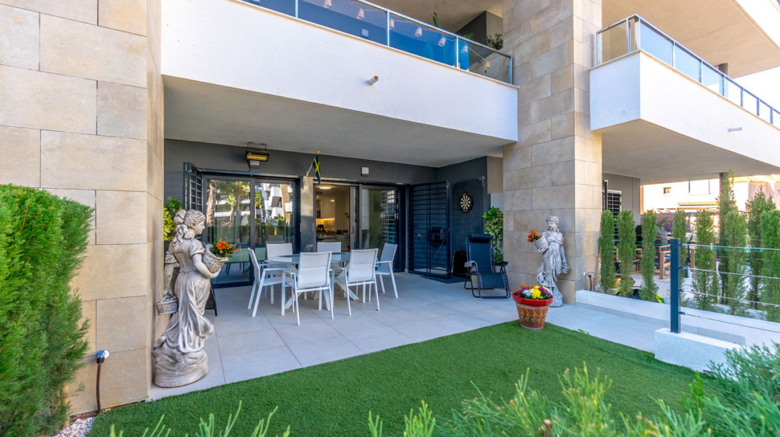 Location:Residencial Flamenca Village is located in Playa Flamenca on the coast of Orihuela, south of the Costa Blanca, about 40 minutes from Alicante airport. The residential area is considered the jewel of the Costa Blanca south. Known for its sandy beaches, luxurious homes and scenic areas on the Mediterranean coast. The variety and quality of the services and restaurants in the area is excellent.The complex is ideally located as the urbanization is quiet and peaceful, but right nearby there is a vibrant life with restaurants and bars that live all year round. The property is close to the popular Zenia Boulevard, the coast's largest shopping center with about 150 stores. In addition, the Saturday market is only a few minutes walk away so you can shop weekly for locally produced fruit and vegetables and other goods at nice prices.In addition, there is mini golf, go-cart, great hiking areas, streets with palm trees and pleasant squares, so there is something for everyone. There are 6 golf courses within a 15-minute drive.It is about 600 meters to the sea and beautiful beaches and about 8 km to the center of Torrevieja.This is a beautiful corner of the Mediterranean, where you can enjoy nature, relax and have fun.Content:Residencial Flamenca Village is a luxurious complex near the sea in an idyllic environment.The apartment, which is located on the ground floor, is 63.30 m2. On the front side facing the pleasant pool, there is a pleasant garden and a large terrace.There is a nice living room with an open solution towards the beautiful kitchen. From here there is access to the laundry room. The two bedrooms have built-in wardrobes and there is a modern bright bathroom. There is also a storage room inside the apartment.The apartment has ducted air conditioning and is sold furnished and with white goods.The urbanization offers you, among other things, large parks, fountains, several pool areas, "chillout lounge area" walkways, gym, jacuzzis, pool bar and playground.The apartment has a parking space inside the area.Price: 395,000 euros + costsFacts:Area: 63.30 m2Garden and terrace: approx. 40 m22 bedrooms1 bathroomAir conditioningFurnishedWhite goodsStorage roomLaundry roomCommunal pool areaPlaygroundJacuzziFitness roomPool barCommunal expenses: 497 euros per quarterYear of construction: 2022/2023Energy certificate: A