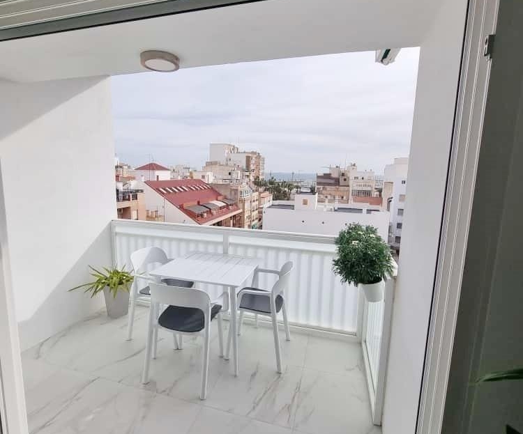 In the heart of Torrevieja, in one of its most privileged and dynamic areas, you will find this spectacular penthouse, a property that combines modernity, comfort and an unbeatable location. Located just 200 metres from the beach and overlooking the new port, this property offers an exclusive lifestyle, marked by light, space and proximity to the sea. Its south-facing orientation guarantees natural light throughout most of the day, creating a warm and welcoming atmosphere in every room. The property, recently refurbished with high-quality finishes, has 100 m² distributed in an intelligent and functional way, providing spacious and modern spaces that are perfectly suited to both everyday life and moments of rest and enjoyment. It has two bedrooms, both with an elegant and contemporary design. One of them has an en-suite bathroom, which provides extra privacy and comfort, as well as built-in wardrobes that optimise storage space. The property includes two full bathrooms, equipped in a modern and practical style, ideal for everyday use and perfectly integrated into the overall design of the penthouse. Every detail has been carefully selected to offer comfort and functionality, without compromising on contemporary aesthetics. The fully equipped French-style kitchen stands out for its elegance and practical integration into the home as a whole. Its design combines aesthetics and performance, offering the perfect space for cooking, entertaining guests or simply enjoying everyday life in a pleasant environment. One of the highlights of the penthouse is its large terrace, a space that becomes the true heart of the property. From here you can enjoy views of the new harbour, the Mediterranean climate and create an ideal atmosphere for gatherings, moments of relaxation or al fresco dining. The south-facing orientation further enhances this space, bathing it in light and making it particularly attractive. The property also has underfloor heating throughout, providing exceptional comfort during the cooler months, and air conditioning in all rooms, ensuring a perfect atmosphere all year round. Overall, this penthouse in the centre of Torrevieja represents a unique opportunity for those looking for a modern, refurbished, bright property in a privileged location by the sea. Its contemporary design, quality finishes and exclusive features make it an ideal home for year-round living or as a luxury residence in one of the most sought-after locations in the city.
