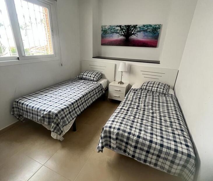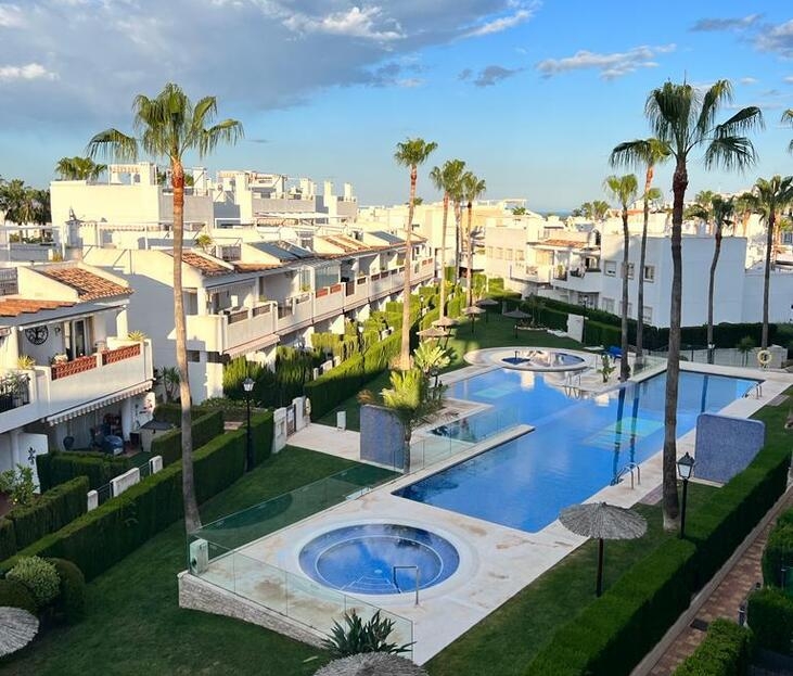 This ground-floor apartment comprises three bedrooms, two bathrooms, and a living room with an open-plan kitchen. The living room opens onto a terrace with a garden. A utility room is also located off the kitchen. The property is sold furnished, with appliances and ducted air conditioning. A designated above-ground parking space is included in the complex. The complex offers a large swimming pool, a jacuzzi, and green areas. The location is close to the La Fuente and Villamartin Plaza shopping centers, several supermarkets, bars, and restaurants.