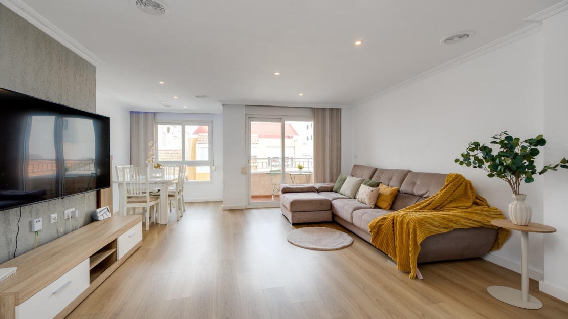 Discover this magnificent and spacious apartment, located right in the heart of Torrevieja, with all amenities at street level and just 700 meters from the sea and the iconic promenade. A privileged location to enjoy the Mediterranean lifestyle without sacrificing comfort. The property has been fully renovated using high-quality materials and is situated on the first floor of a building with an elevator. It offers a modern, functional, and elegant layout designed for maximum comfort. Upon entering, you are welcomed by a spacious and bright living-dining area with access to a charming terrace, perfect for enjoying a fresh and pleasant atmosphere. The fully equipped open-plan kitchen with breakfast bar connects to an interior patio with a laundry area, adding everyday practicality. The apartment features 3 spacious double bedrooms and 2 full bathrooms. The master bedroom, with en-suite bathroom, stands out for its walk-in wardrobe, private bathroom, and access to a rear terrace with south-facing orientation, flooding the home with natural light. This terrace is ideal for relaxing and enjoying the Mediterranean climate and also includes a storage area providing valuable extra space. ???? A rare added value: the price includes two parking spaces in the same building, a true luxury in such a central location. An exclusive property, ready to move into. Don’t miss this opportunity!