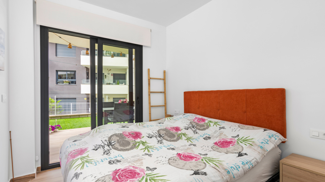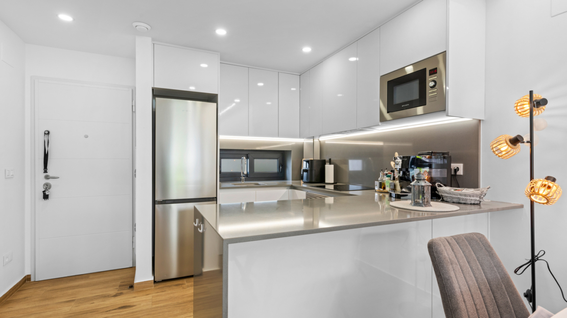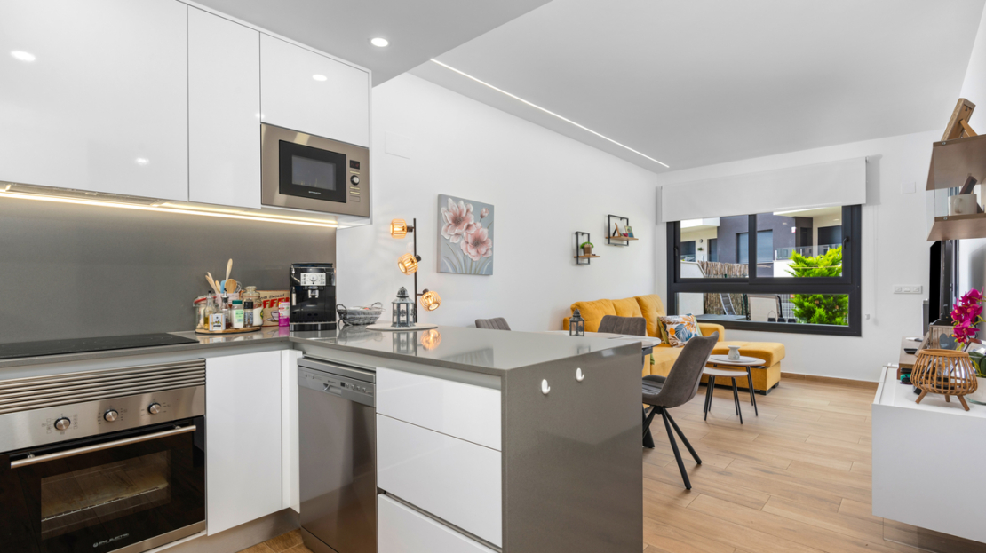 This modern ground floor corner apartment with 2 bedrooms, 2 bathrooms is situated in Villamartin, Alicante set in a great location only a few minutes walk to all local amenities (restaurants, bars and shops). The fantastic La Zenia beach and La Zenia Boulevard shopping centre is also a 10 minute drive. Villamartin Plaza and Villamartin Golf are less than 4 minutes away.The property is comprised of a spacious lounge area, an open plan kitchen/dining area, electric shutters, air conditioning (hot/cold) throughout the property, a main bedroom with fitted wardrobes and en-suite bathroom, a further guest bedroom with fitted wardrobes and a second bathroom with walk-in shower. Patio doors lead out onto a private terrace (with small utility room) to enjoy the sun all day.Private allocated parking space is also included. There is a lovely communal green area with communal swimming pool, petanque zone, children's playground and a beautiful communal park.These apartments are fantastic value for money and the location is great with the bars, restaurants and amenities only a short walk away.The Villamartin area is very popular with tourists and most of the population consists of Western European expatriate communities who have settled there in the last 10 years, virtually transforming the village into a modern-looking town. There are also other golf courses nearby and numerous white sandy beaches.
