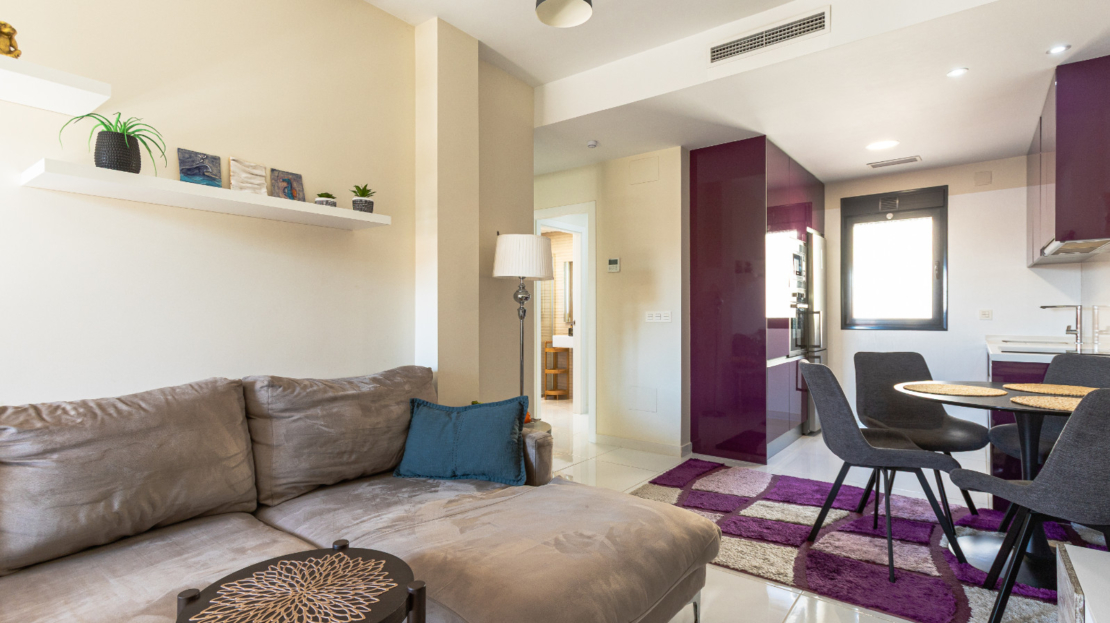 ¡Bienvenido a este moderno y luminoso bungalow en planta alta con su propia terraza en la azotea, tan grande como todo el apartamento!Desde la puerta principal se accede al espacioso salón, conectado al comedor y, en la parte trasera, a una cocina bien equipada. El dormitorio principal tiene su propio baño en suite, mientras que el segundo baño da servicio al segundo dormitorio. Tanto el salón como el dormitorio principal tienen puertas que dan a un balcón orientado al sur, desde el cual unas escaleras exteriores conducen a la terraza en la azotea. Esta terraza ofrece amplias vistas a las montañas y a los alrededores. Puede abrir el toldo de la terraza y crear un espacio protegido para disfrutar del clima mediterráneo.La piscina del complejo está a solo veinte metros, ofreciendo un oasis verde para relajarse.El supermercado Aldi está a tiro de piedra, y también hay varios restaurantes y bares a poca distancia a pie en el centro comercial Via Park 3.Las playas de arena de Punta Prima y Playa Flamenca están a solo unos 10 minutos en coche. Zenia Boulevard está a unos 10 minutos en coche, también puedes llegar a Zenia Boulevard en autobús desde la parada justo enfrente del apartamento.