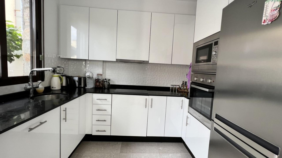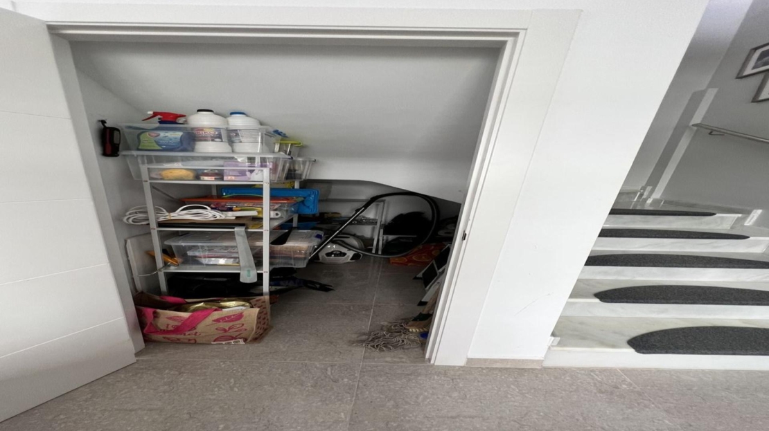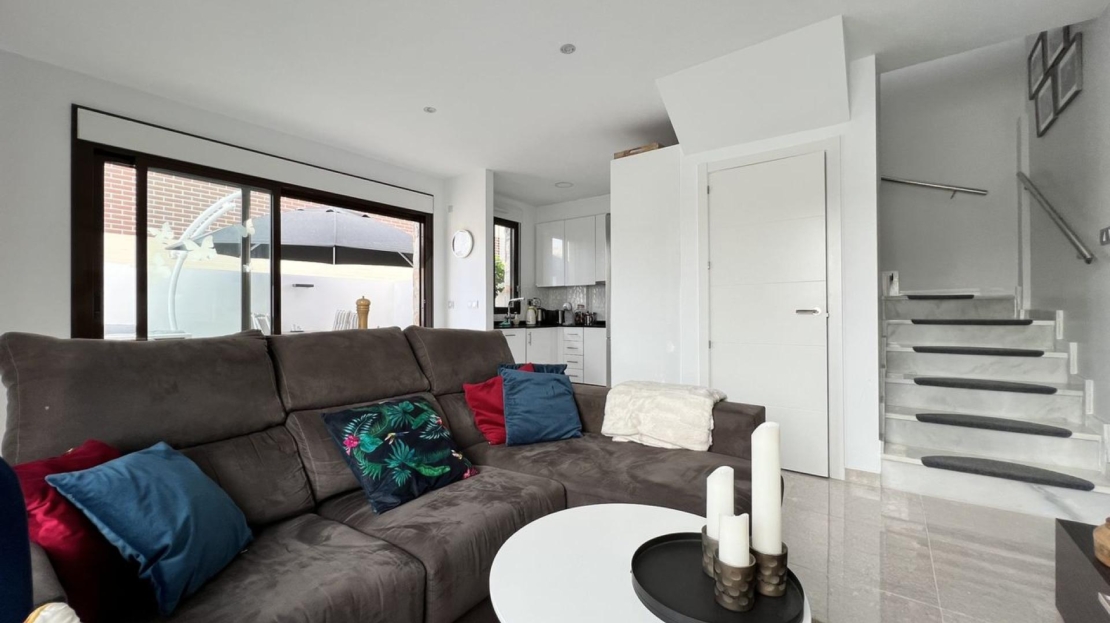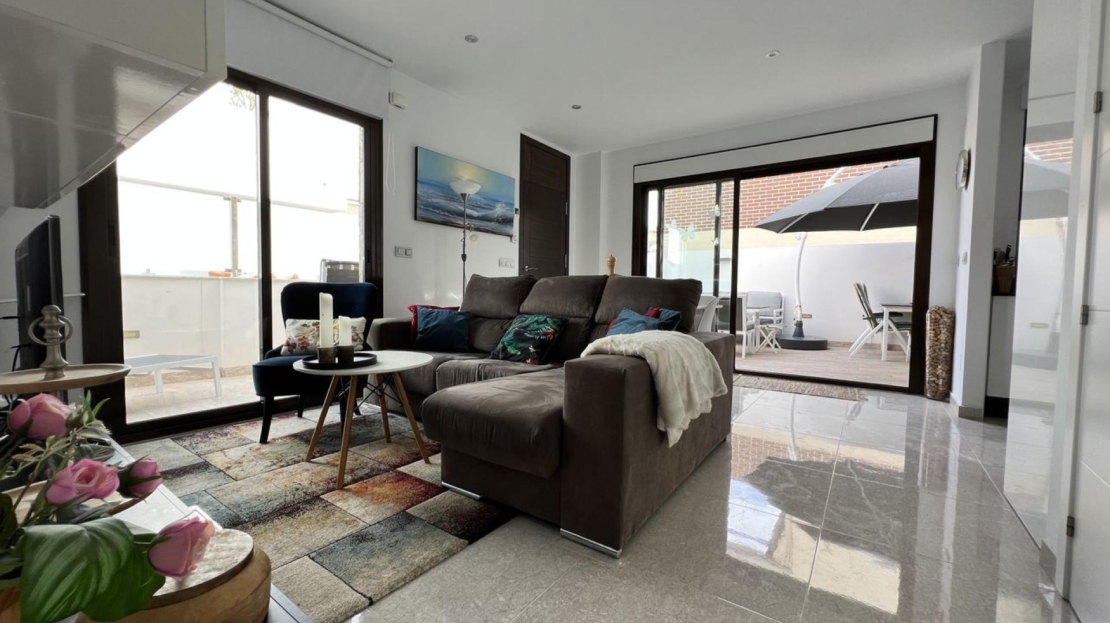 En Cabo Roig, dentro de la exclusiva urbanización Residencial Sinergia World Fase III, se encuentra este precioso chalet pareado de dos plantas con solárium, ubicado en un complejo privado construido en 2017 y con orientación noreste.La vivienda se distribuye de forma muy cómoda: en la planta baja encontramos un luminoso salón-comedor, cocina francesa, galería, además de 1 dormitorio con armario empotrado y 1 baño completo, ideal para mayor comodidad o para invitados. En la primera planta se sitúan 2 amplios dormitorios con armarios empotrados, 1 baño completo y una agradable terraza.En el exterior destaca un amplio jardín enlosado en esquina, perfecto para disfrutar del clima mediterráneo durante todo el año. La propiedad también cuenta con un gran solárium privado, equipado con toldo y cocina de verano, ideal para relajarse o compartir momentos con familia y amigos.El residencial ofrece excelentes zonas comunes con piscina comunitaria, gimnasio y sauna, creando un entorno cómodo y exclusivo.La propiedad incluye plaza de aparcamiento subterránea privada con trastero y se vende totalmente amueblada y equipada, lista para entrar a vivir.Ubicación excelente, cerca de todos los servicios, a solo 2,5 km de la playa, 3 km de campos de golf y aproximadamente 45 minutos del Aeropuerto de Alicante.Gastos de comunidad: 660€ al añoIBI: 360€ al año