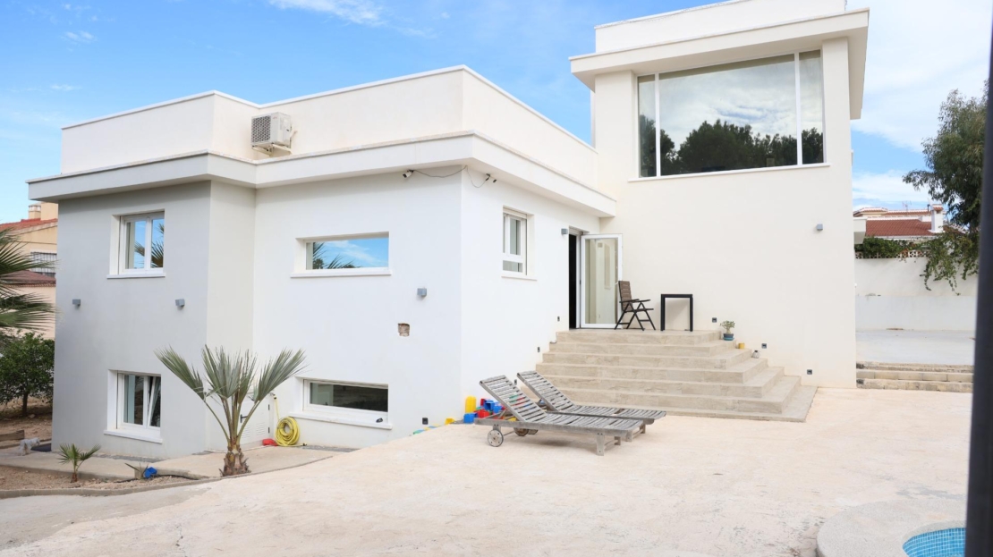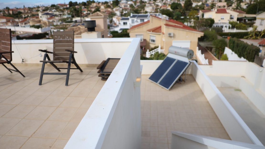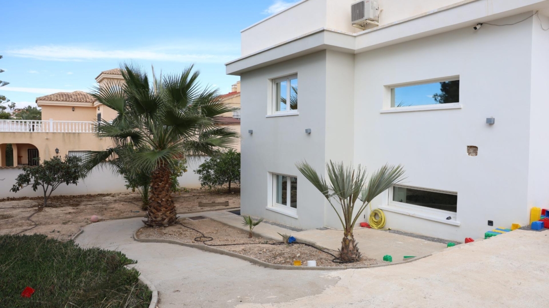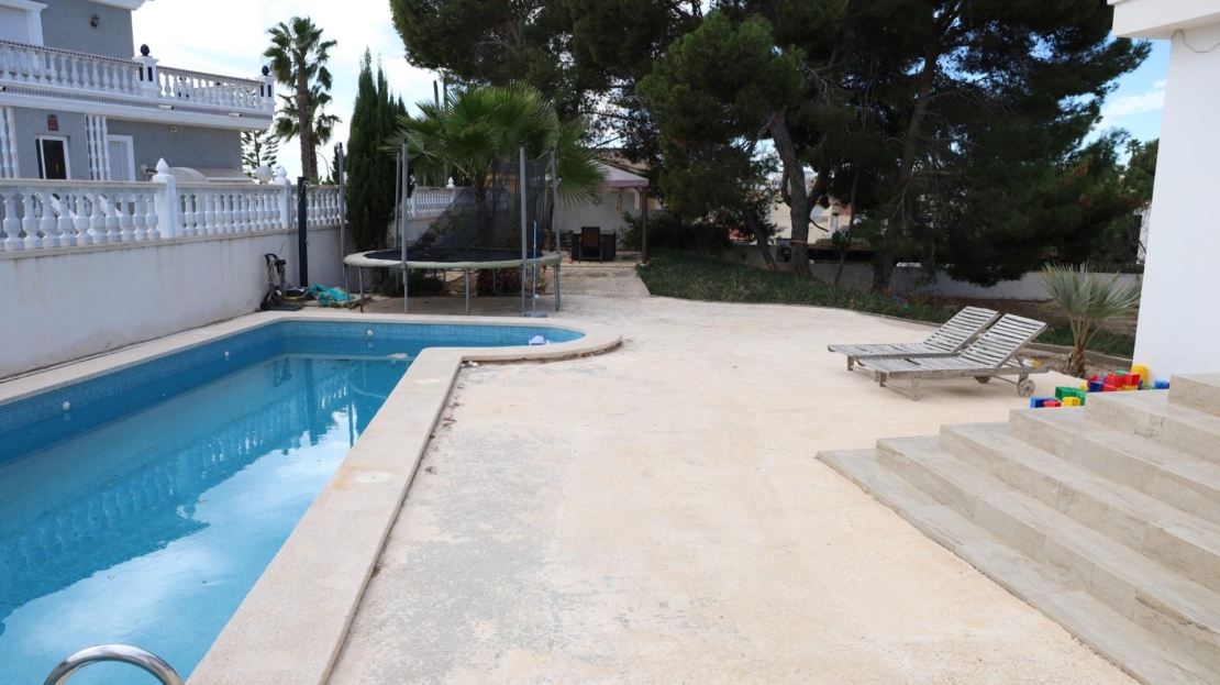 Chalet with pool and 5 bedrooms in Ciudad Quesada (Rojales) Spacious and bright chalet, whose major renovation began in 2020 and was completed in 2024 (Final de obra document available). Located in the prestigious Ciudad Quesada urbanization in Rojales. The property sits on a large plot of approx. 1,100 m² (800 m² recorded in title). Main level: – 5 bedrooms, including the spacious master with walk-in closet and en‑suite bathroom; – 3 bathrooms and 1 guest toilet; – Bright living room with fireplace; – Fully equipped open-plan kitchen. Semi-basement level: – Large room, storage, guest toilet and kitchen hookups — ideal for guest apartments with separate entrance; – Currently used as a massage and hair salon with independent access. Outdoor area: – Private pool, terrace area needs updating; – Rooftop solarium; – Plot offers space for garden, relaxation area and car shelter; – Gate access and possibility to park right next to the house. The house is in excellent condition and offers many possibilities to adapt the space. Location: – Just 6 km from the beach; – Quiet green area with local amenities: shops, cafés, park and lagoon nearby. KEY ADVANTAGES: – Renovation completed in 2024 – Spacious bright home with 5 bedrooms – Master bedroom with closet and en-suite bathroom – Potential for separate guest apartments – Private pool and solarium – Parking next to house, possibility for carport – Quiet area with nature and urbanization – New air conditioning units in all rooms An excellent choice for family living, vacation or investment — combining space, quality and location. Contact us for more information or to book a viewing — multilingual service available.