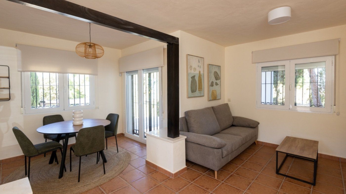 This unusual design semi-detached villa has 2 bedrooms and 1 bathroom, independent kitchen, living room with patio doors leading onto the covered porch and semi covered roof top terrace.