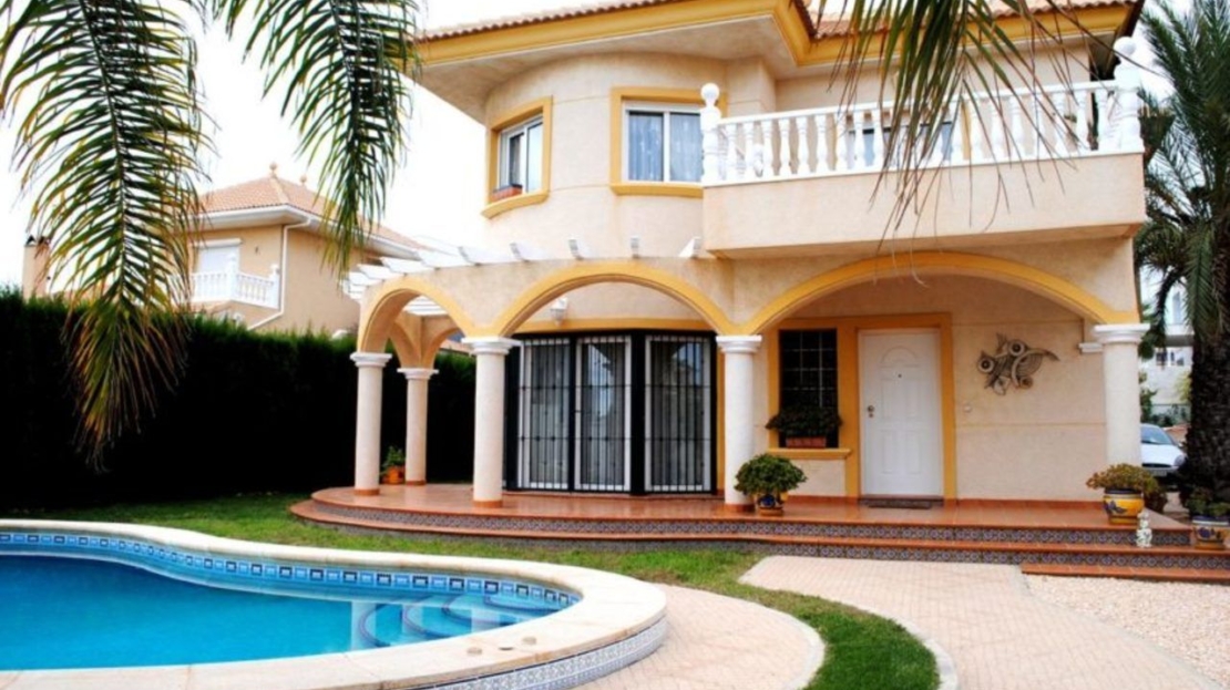 The property itself is situated on a very quiet road, each property having adequate privacy. On approaching the property you notice it has both a pedestrian gate and double gates for vehicles. Once inside the grounds the first thing that stands out is the generously sized swimming pool. Further up the path you will reach the steps up to the porch and reinforced entrance door. You can access the back of the property from the outside as the pathway leads all around. There is a driveway where up to 5 cars can park and leads to the garage with electric door. Stepping inside the property you will be taken aback at the abundantly sized lounge/diner, with working log burning fireplace. This room is very light and airy but most of all spacious. The downstairs bathroom is just off the lounge and is fully tiled with a walk in shower as well as a bidet, w/c and sink. There is also a very large storage cupboard under the stairs. Onward from the lounge/diner, you walk into the kitchen area which is open plan to another great size reception room. The reception room is currently used as another dining area with plenty of space for the whole family and guests! In the kitchen you will find a large integrated fridge/freezer with electric oven and electric hobs, the kitchen also has an exterior door leading to another small terrace and the BBQ area. Through from the kitchen/reception room, you will come to the downstairs bedroom/office with plenty of space for either 2 x single beds or a double. This room is currently being used as an office, This room has the utility area just off from it, the utility area has the washing machine, boiler and plenty of storage space for cleaning appliances etc. Going upstairs on the marble staircase you get to the landing and a patio door to the front facing balcony, here you have incredible panoramic views of La Zenia this is also where you will find the sun in the mornings. Both bedroom ½ are of a good size built in wardrobes and plenty of storage, both bright and sunny. Bedroom 3 the master bedroom is a large room with en-suite bathroom which features his and her sinks, bidet and enormous bath with Jacuzzi jets. This room has a patio door leading to a private balcony where you will find the sun in the afternoon. The family bathroom is fully tiled with bath and additional shower installed.La Zenia is such a sought after location, ideally placed for easy access to fine restaurants, bars with live entertainment, excellent golf courses for the avid golfer and golden beaches for the sun worshipper or swimmer. For day trips out head north to the inland town of Elche famous for its palms or go south to the Mar Menor where the La Manga Club is located. The historic city of Murcia is not far and here there are a couple of good shopping malls. If you want history, nearby Rojales and Orihuela have old towns and cave houses. Torrevieja is still very Spanish and has wonderful beaches and promenade just some of the interesting places to explore. Just 15 to 20 minutes to Murcia airport it is so easy for holiday makers to travel to. Or if you are living here full time not long to get to the airport to visit relatives in the UK or other European countries.