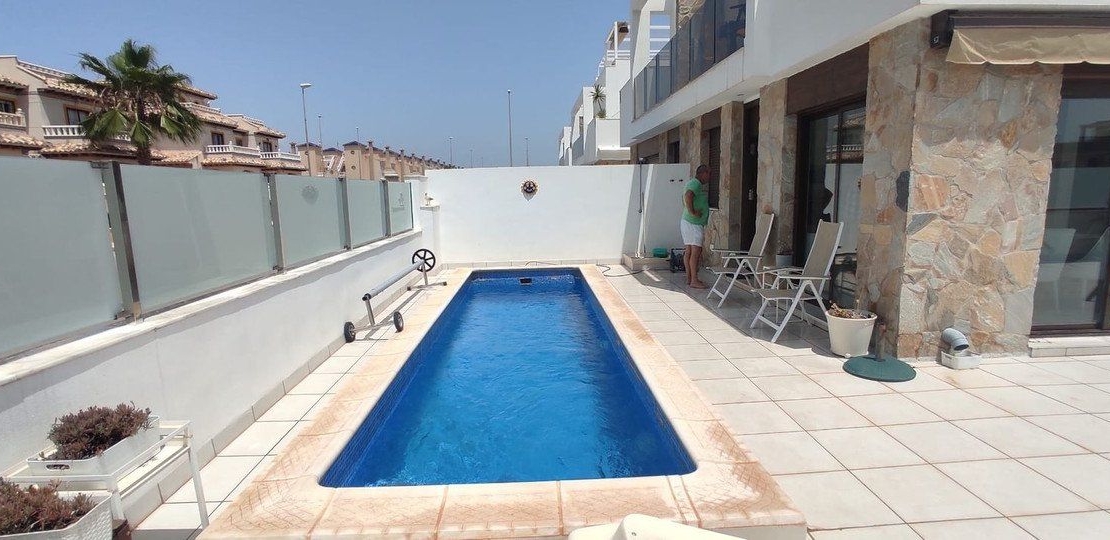 Welcome to Lomas de Cabo Roig in Orihuela Costa, where luxury and modern living come together in this exquisite detached villa. This stunning property offers an unparalleled combination of style, comfort, and convenience, providing an idyllic retreat for those seeking a truly exceptional lifestyle.Nestled within a peaceful residential area, this modern villa boasts a contemporary design that seamlessly blends with the surrounding Mediterranean landscape. The exterior showcases clean lines, sleek finishes, and large windows that allow natural light to flood the interiors, creating a bright and airy ambiance.As you enter the villa, you are greeted by a spacious and inviting living area that serves as the heart of the home. The open-plan layout effortlessly connects the living room, dining area, and a fully equipped modern kitchen, making it an ideal space for entertaining guests or enjoying quality time with family.The villa features two bedrooms, providing ample space for relaxation and privacy. Each bedroom has been thoughtfully designed to offer a tranquil sanctuary, with tasteful decor, built-in wardrobes, and large windows that frame picturesque views of the surrounding landscape.The villa also boasts two luxurious bathrooms, showcasing contemporary fixtures and finishes. These well-appointed bathrooms offer a spa-like atmosphere, where you can indulge in a rejuvenating bath or invigorating shower after a long day.One of the standout features of this exceptional villa is the private heated swimming pool, perfect for year-round enjoyment. Whether you prefer a refreshing dip on a hot summer day or a relaxing swim under the stars, this pool offers the ideal setting. The pool area is complemented by a spacious terrace, providing ample room for sun loungers, outdoor dining furniture, and a barbecue area, allowing you to make the most of the fantastic Mediterranean climate.Additionally, the villa boasts a large solarium, offering breathtaking panoramic views of the surrounding area. This versatile space provides an ideal spot for sunbathing, hosting gatherings, or simply unwinding while enjoying the stunning vistas.Lomas de Cabo Roig is a sought-after location, known for its tranquil atmosphere and proximity to a wide range of amenities. Within a short distance, you'll find pristine sandy beaches, championship golf courses, vibrant restaurants, shops, and entertainment options, ensuring that you have everything you need within easy reach.In summary, this modern detached villa in Lomas de Cabo Roig presents a rare opportunity to own a luxurious retreat in one of Orihuela Costa's most desirable locations. With its private heated swimming pool, spacious terrace, solarium, two bedrooms, and two bathrooms, this property offers a perfect blend of comfort, elegance, and modern living.Detached Villa, Orihuela Costa, Costa Blanca.2 Bedrooms, 2 Bathrooms, Built 100 m², Terrace 50 m².Setting : Close To Golf, Close To Port, Close To Shops, Close To Sea, Close To Town, Close To Schools, Close To Marina, Urbanisation.Orientation : North East, East, South, West.Condition : Excellent.Pool : Private.Climate Control : Air Conditioning, Hot A/C, Cold A/C.Views : Street.Features : Fitted Wardrobes, Private Terrace, Solarium, Marble Flooring, Double Glazing.Furniture : Fully Furnished.Kitchen : Fully Fitted.Parking : Underground, Private.Category : Resale.