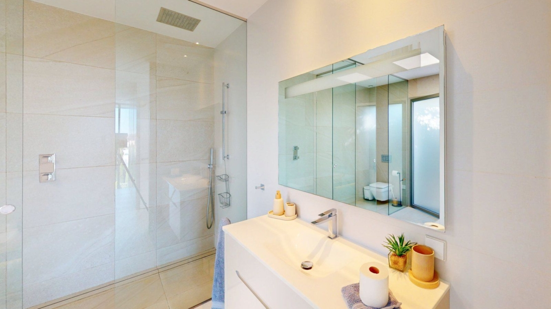 The outdoor areas are ideal for entertaining, with multiple terraces, BBQ zone, outdoor shower, and a panoramic rooftop solarium boasting views of the golf course and sea.