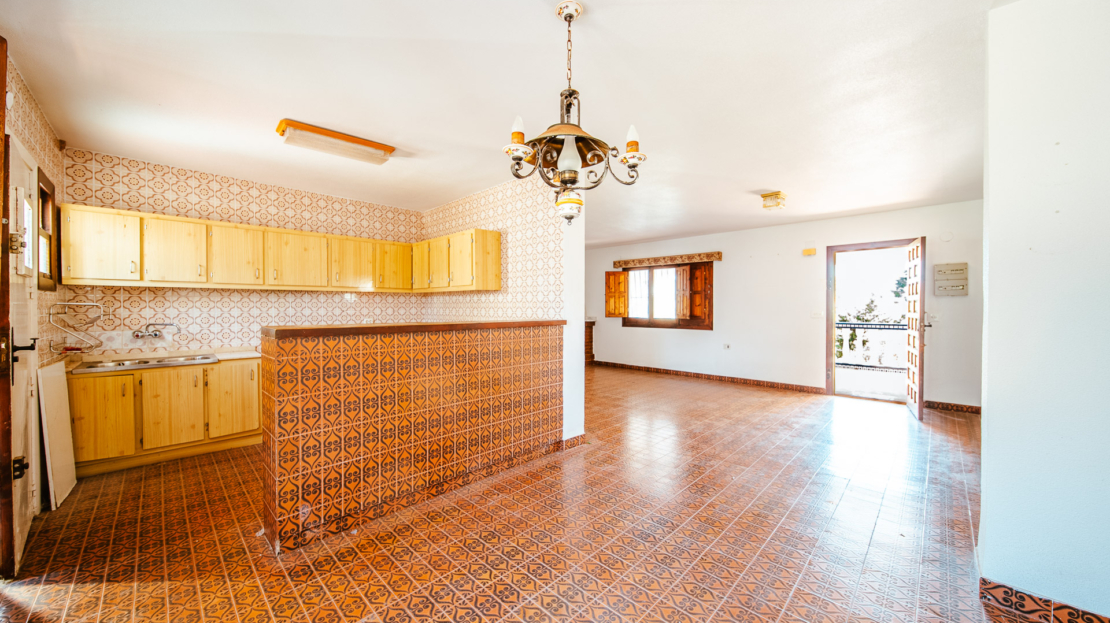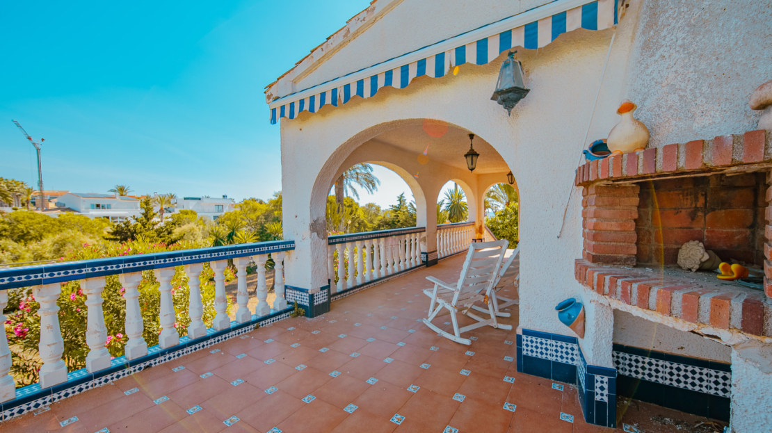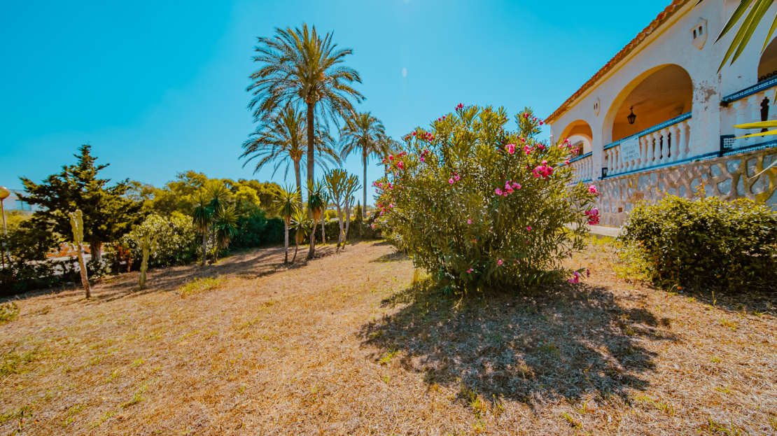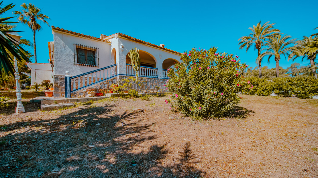 Unique opportunity to renovate a Mediterranean-style villa with sea views. Located just 100 m from the beach, this single-storey property offers 4 bedrooms, 2 bathrooms, a living room with fireplace, 2 kitchens, a porch, and a large 1,081 m² plot – ideal for adding a private pool and creating a dream home by the sea.