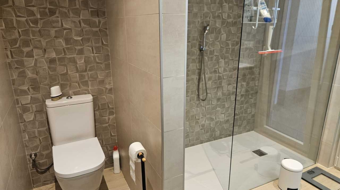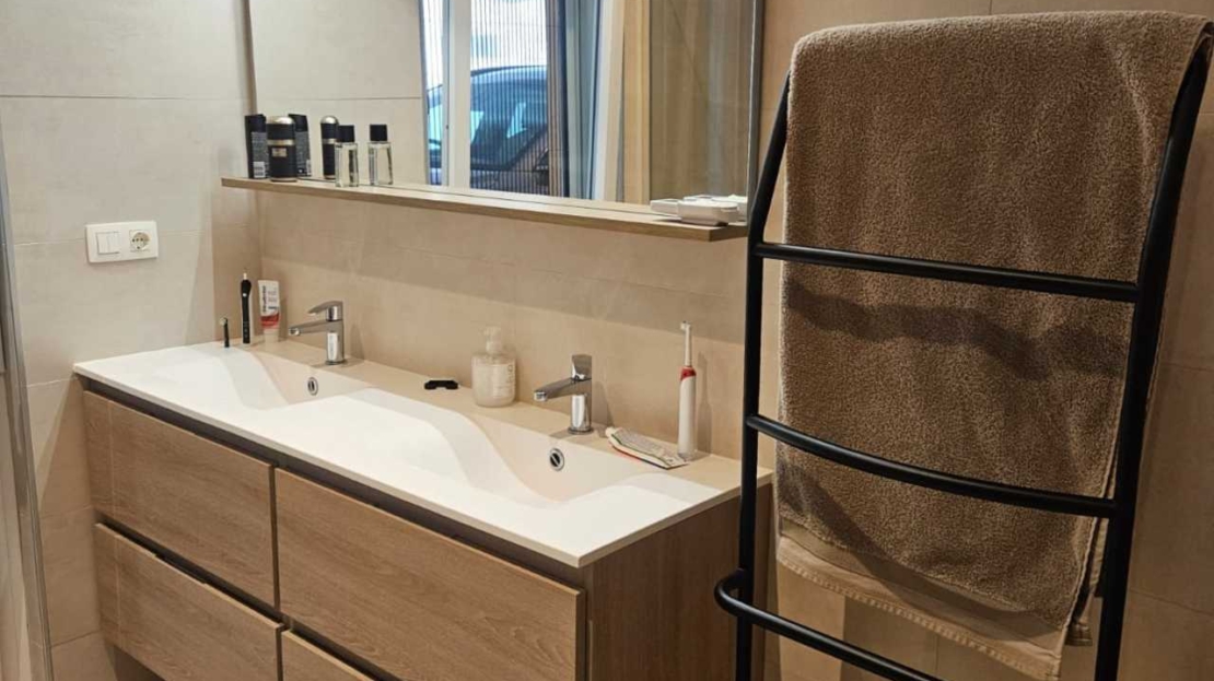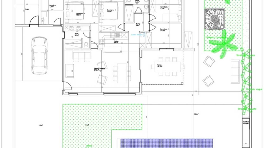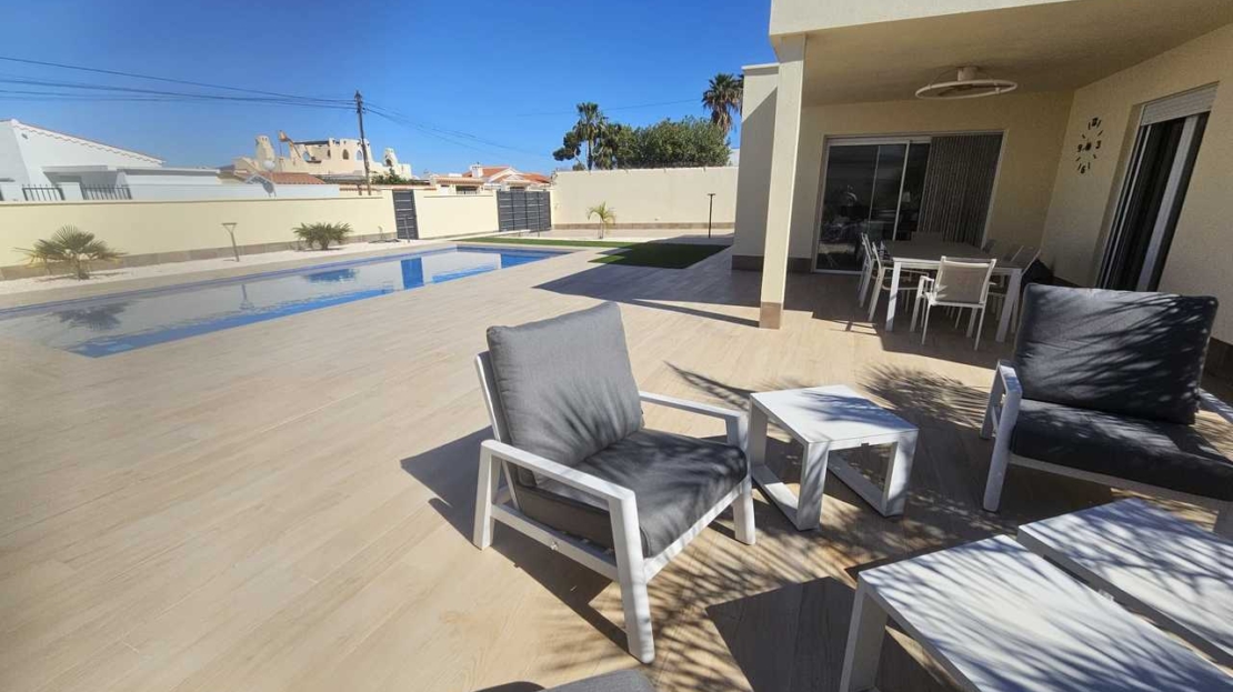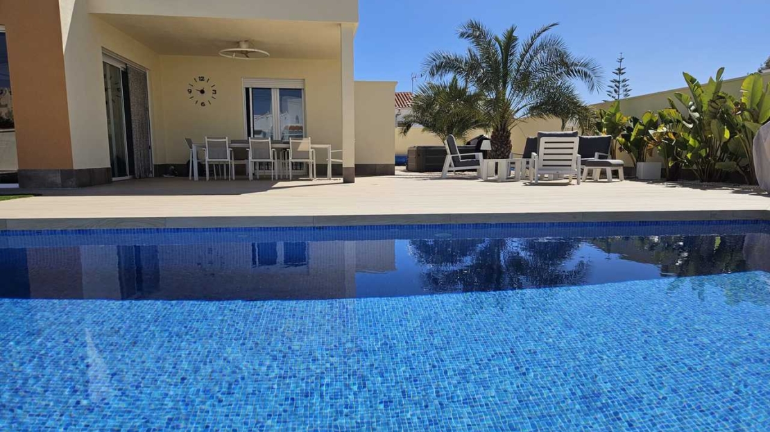 Beautiful detached 4 bedroom villa on an 800m² plot, with a garden and a private swimming pool in La Torreta, Torrevieja, Alicante.The main house has a living/dining room with an open plan fully equipped kitchen with a dishwasher, oven, Siemens induction hob and large refrigerator. The kitchen is right next to a large 150m² terrace. There are four bedrooms and two bathrooms.Behind the main house is a 63m² small house currently used as storage, but previously it had a living/dining room, kitchen, a bedroom and a bathroom. The main house has air conditioning in each room.There are 30 solar panels on the roof and a 15Kw battery. The electricity bill is 0€.Outside there are two large terraces with a large swimming pool (10×4,5), next to which is a jacuzzi and an outdoor shower with hot water.There is also a large porch to park a car out of the sun, an alarm system inside the house but also on the outside. Also CCTV system and doorbell that is linked with your smartphone.
