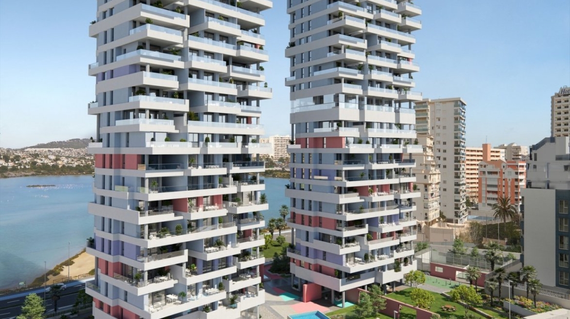 Deux tours de 18 étages avec de beaux appartements avec vue sur la mer et le lac salé de Calpe.
