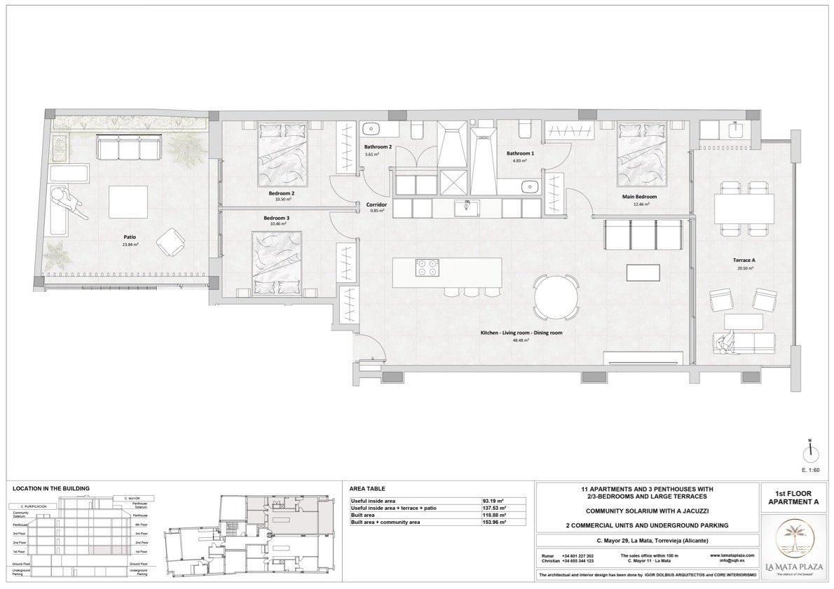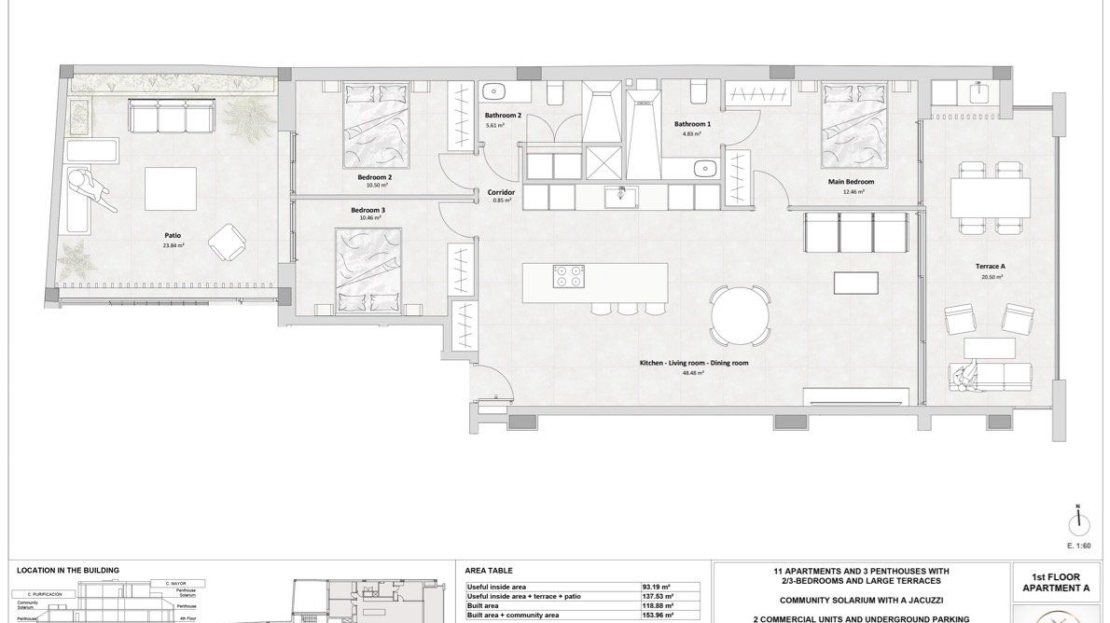 Situé au premier étage, l'appartement dispose de 3 chambres et 2 salles de bains, réparties sur une superficie de 93 m². Il comprend également une grande terrasse de 21 m² et un patio intérieur de 23,84 m², soit une surface construite totale de 138 m².