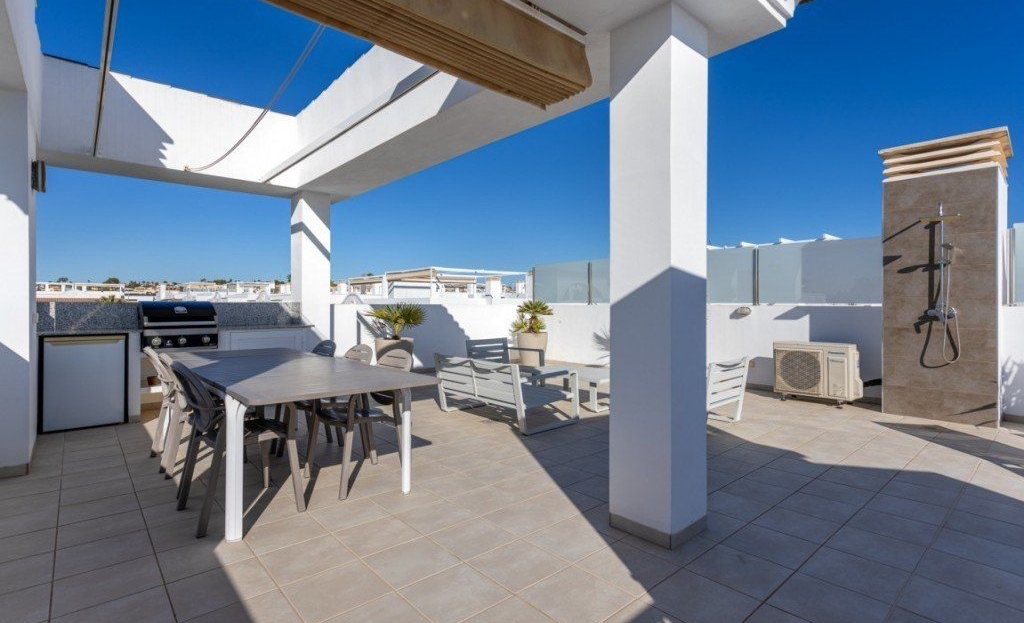 Penthouse de luxe à vendre à Ciudad Quesada – Costa Blanca SudDécouvrez ce superbe penthouse moderne à vendre à Ciudad Quesada , l'un des endroits les plus prisés de la Costa Blanca Sud, en Espagne. Entièrement meublé et équipé, ce bien offre confort, style et vues imprenables : le choix idéal pour une maison de vacances, un investissement ou une résidence principale en Espagne.Aperçu de la propriétéType : Appartement PenthouseLieu : Ciudad Quesada, Rojales – Costa Blanca Sud, AlicanteChambres : 2 spacieuses, entièrement meubléesSalles de bains : 2 modernes et bien aménagéesCuisine : Entièrement équipée avec des appareils haut de gammeEspace de vie : Salon lumineux et spacieux avec une décoration moderneTerrasses : 2 terrasses privatives, dont une avec coin repasSolarium sur le toit : terrasse privée de 78 m² avec vue panoramique sur le lagon et le jardinFonctionnalités exclusives sur le toitCe penthouse exceptionnel avec terrasse privée sur le toit offre tout pour vivre en plein air en Espagne :Grande table à manger avec six chaises et parasol rétractableEnsemble de salon élégant et chaises longuesCuisine extérieure complète avec barbecue, réfrigérateur et évierDouche extérieure avec eau chaude et froideCommunauté et commoditésSituée dans un complexe résidentiel magnifiquement entretenu, la propriété comprend :Trois grandes piscines communesJardins paysagers avec palmiers et espaces vertsAire de jeux et espace fitnessCourts de tennis gratuitsPlace de parking privée dans un domaine sécurisé avec trois portails électriquesEmplacement privilégié sur la Costa BlancaCe penthouse à Ciudad Quesada est idéalement situé à proximité de toutes les commodités — supermarchés, restaurants, terrains de golf et centres médicaux — et à quelques minutes en voiture de la côte :Torrevieja : 5 minutesGuardamar del Segura : 10 minutes – célèbre pour ses plages de sable doréGolf de La Marquesa: à proximitéExcellente connectivitéAéroport d'Alicante-Elche : 30 minutesAéroport de Murcie-Corvera : 1 heurePourquoi choisir cette propriétéCe penthouse de luxe à vendre sur la Costa Blanca allie design moderne, confort et emplacement privilégié. Que vous recherchiez un appartement de vacances en Espagne , un investissement locatif ou une maison au soleil , ce bien offre un rapport qualité-prix et un style de vie exceptionnels.