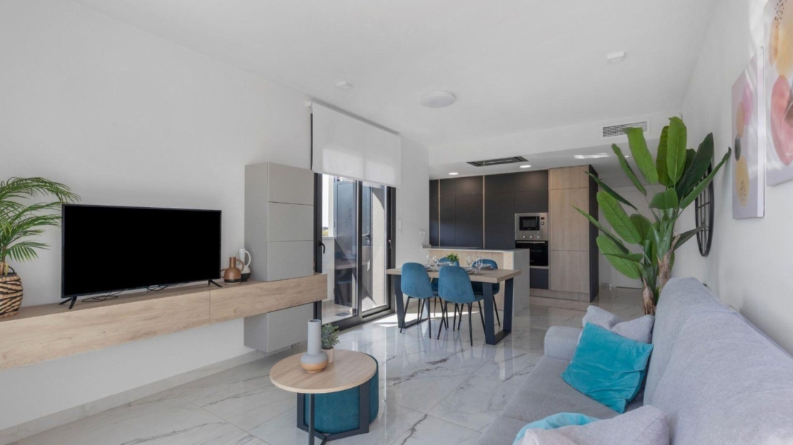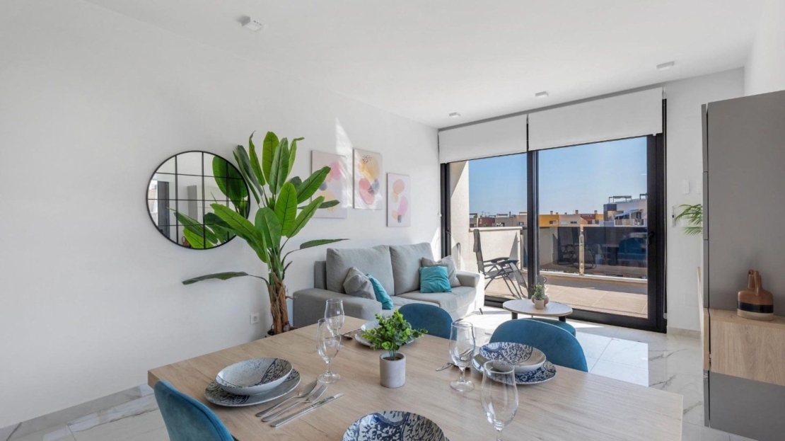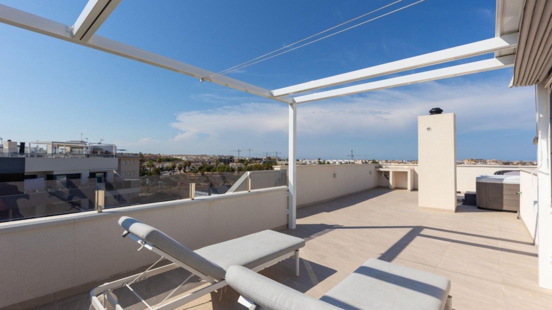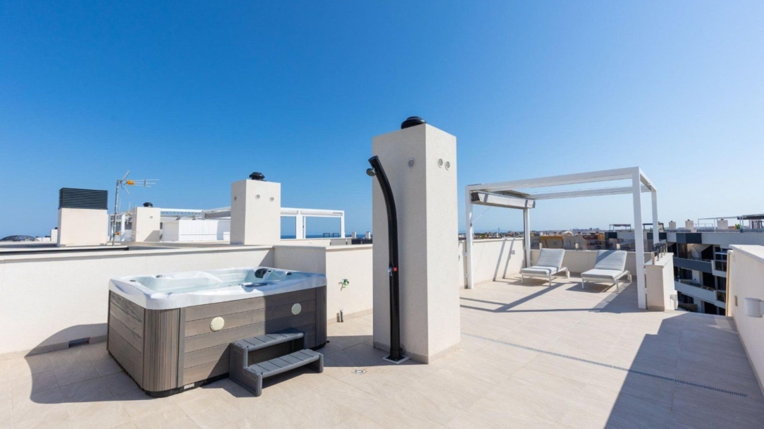 Discover this attractive penthouse located in the exclusive Amanecer Deluxe residential complex.—a modern and quiet urbanization known for its contemporary design and excellent location. The property offers 75 m² of built space, including 2 spacious bedrooms, 2 full bathrooms, a fully equipped open-plan kitchen, and a large, bright living-dining room with access to a cozy terrace. It also boasts a spectacular 60 m² private solarium with a jacuzzi—perfect for enjoying the Mediterranean climate, sunbathing, or relaxing with open views. This new residential area offers all essential services nearby: supermarkets, sports centers, leisure areas, restaurants, and more. Located just a few minutes’ drive from both the center of Torrevieja and Orihuela Costa, in a strategic area with upcoming infrastructure improvements and better future connectivity with nearby beaches. Ideal both as a permanent residence and as a holiday or investment property.