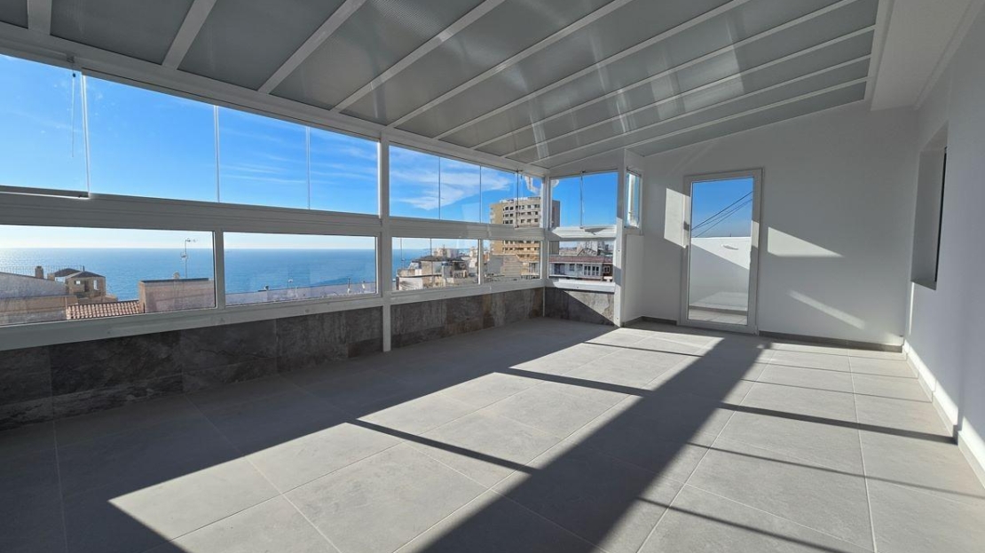 Penthouse with stunning sea views, totally refurbished, contemporary and elegant design, a few steps from the Natural Pools and the beach “Playa del Cura”. It consists of a living room with access to the terrace, an open-plan kitchen, a double bedroom, a single bedroom, a bathroom with an Italian shower, a very large glazed terrace (approx 26 m2) with sea views and a storage room. South facing! Air conditioning in the living room and the double bedroom. Unfurnished. Kitchen without furniture and without domestic appliances. Bright and sunny. Lift in the building. Intercom system. Completely renovated in December 2025 with high-quality materials. Perfect location, close to all amenities, restaurants, cafes, shops, supermarkets, the seafront Promenade, the new Torrevieja port leisure area “Paseo del Mar” and the beach. Ready to move in and enjoy the beach and the wonderful Mediterranean climate.