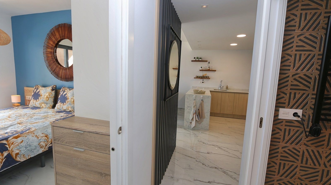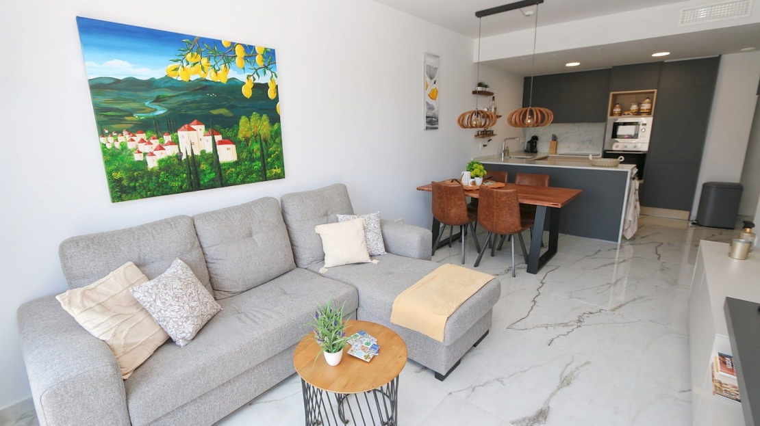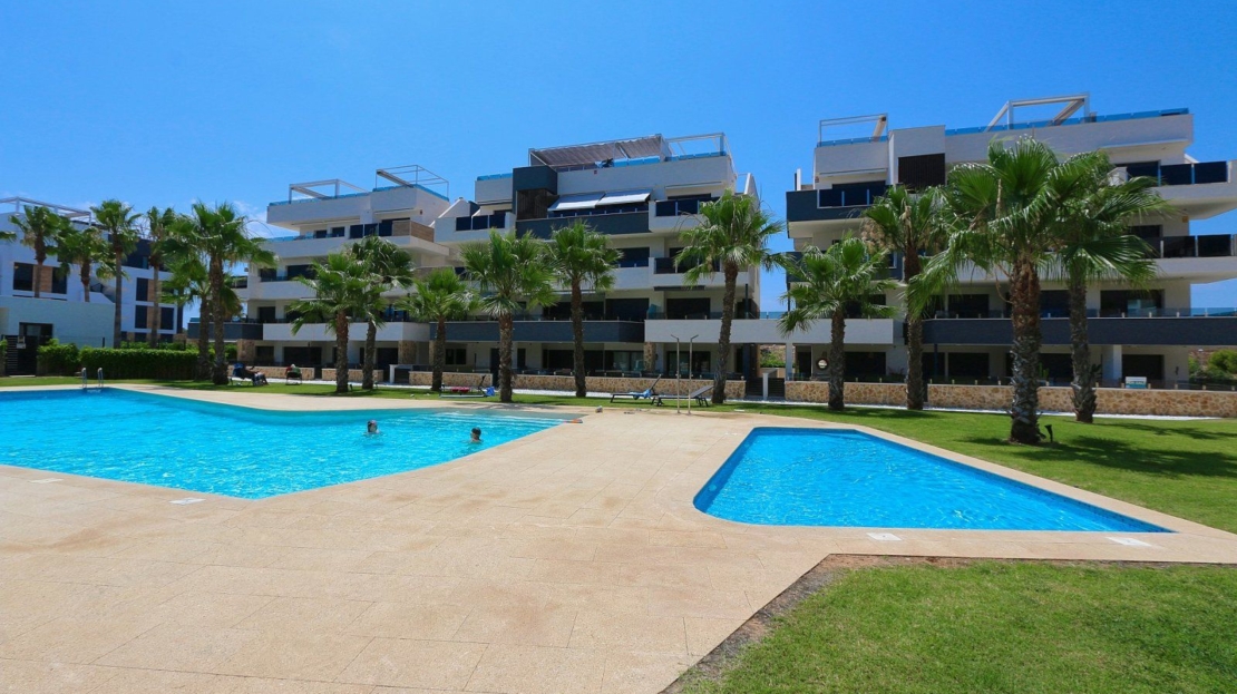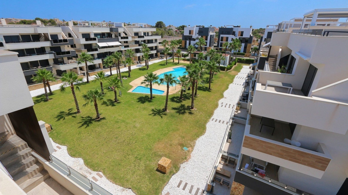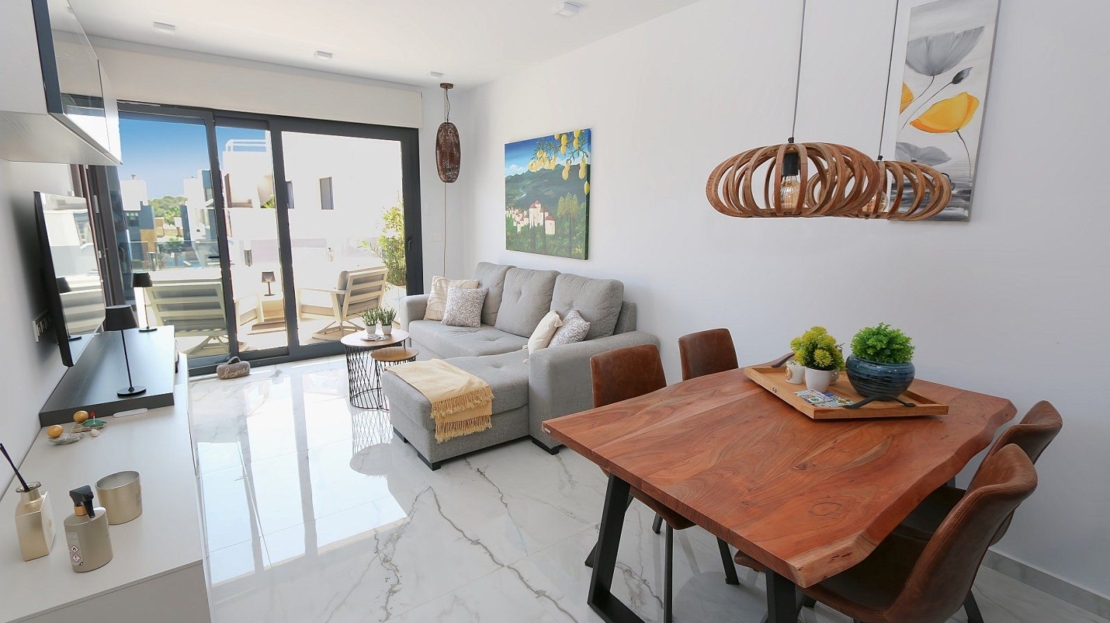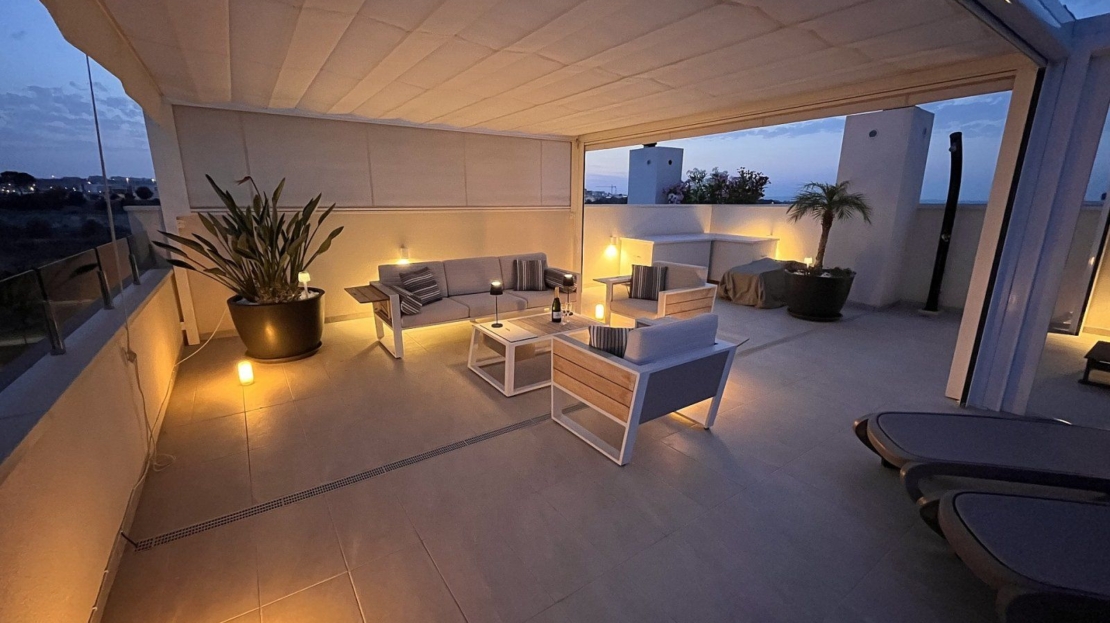 Luxury penthouse with rooftop terrace and Jacuzzi!. Welcome to this beautifully finished and partly furnished apartment in the popular Los Altos (Orihuela-Costa) with jacuzzi!Located in the new Amanecer IX complex, with a private rooftop terrace, balcony, and luxurious jacuzzi – this is outdoor living at its finest on the Costa Blanca.Inside, you’ll find 2 comfortable bedrooms and 2 stylish bathrooms. The apartment, with nearly 71 m² of living space, is cleverly laid out and equipped with modern comforts, including air conditioning with an Airzone system – allowing you to adjust the climate in each room individually.The bright living room connects directly to the open kitchen and the sunny 21 m² balcony. But the real wow-factor awaits upstairs, on the spacious solarium of almost 80 m². Here, you can fully unwind – with sunshine, privacy, and your very own jacuzzi under the pergola. The two pergolas with side panels provide both shade and ambiance – all year round.The apartment is offered partly furnished, with stylish interior furniture, various accessories, and many practical items included.The complex itself offers extra comfort and luxury: residents have access to a communal swimming pool, a fitness room and a relaxing sauna. Everything you need to enjoy peace, exercise and convenience all year round – right at your fingertips.Los Altos is known for its relaxed atmosphere, excellent amenities, and location close to beaches, shops, and restaurants. The property is part of a modern and high-quality complex in Los Altos. A unique opportunity for anyone seeking comfort, space, and outdoor living under the Spanish sun.Will you soon be enjoying this view?