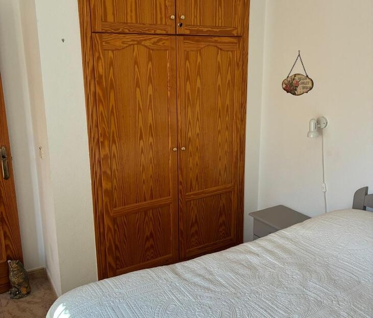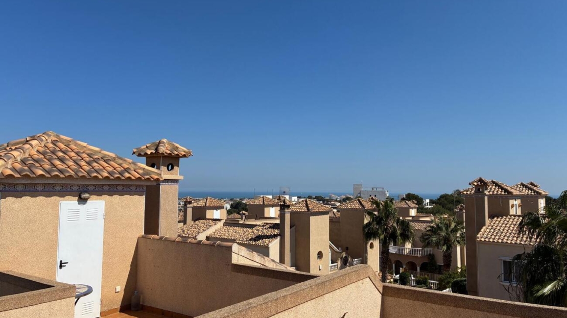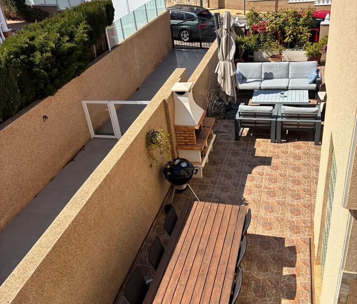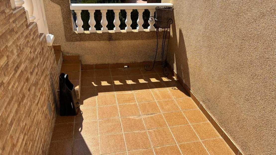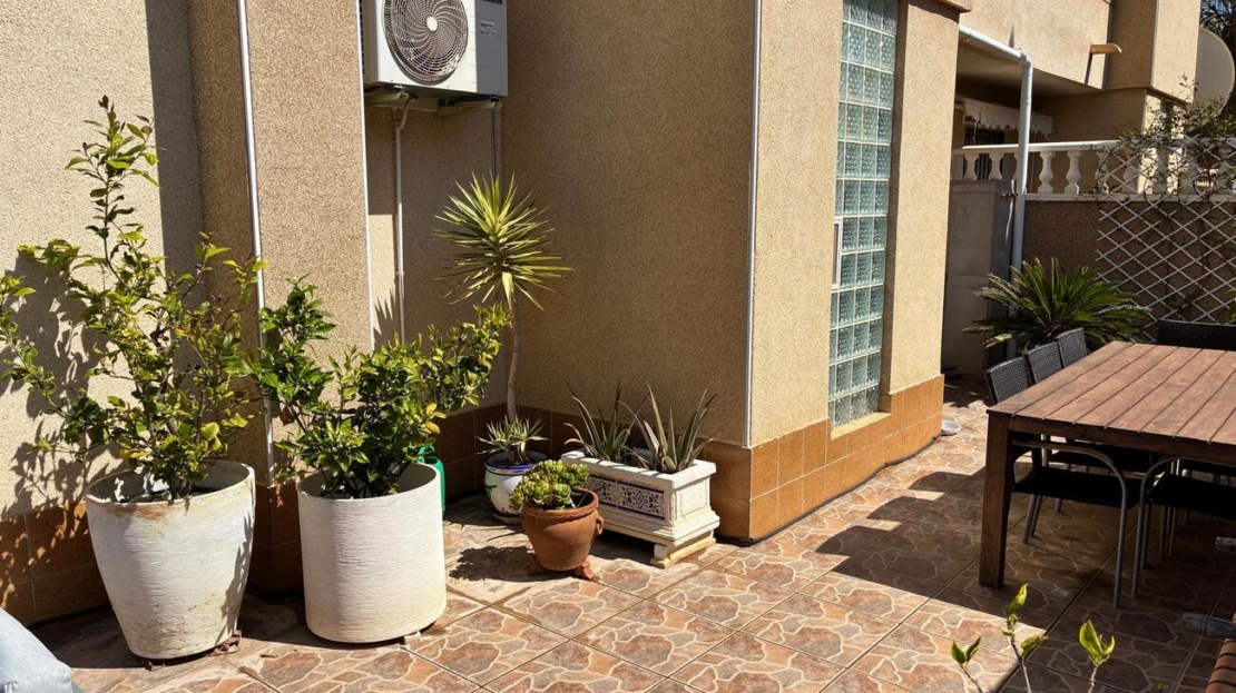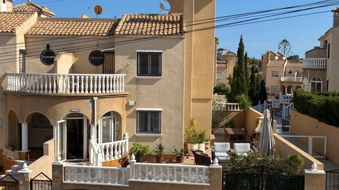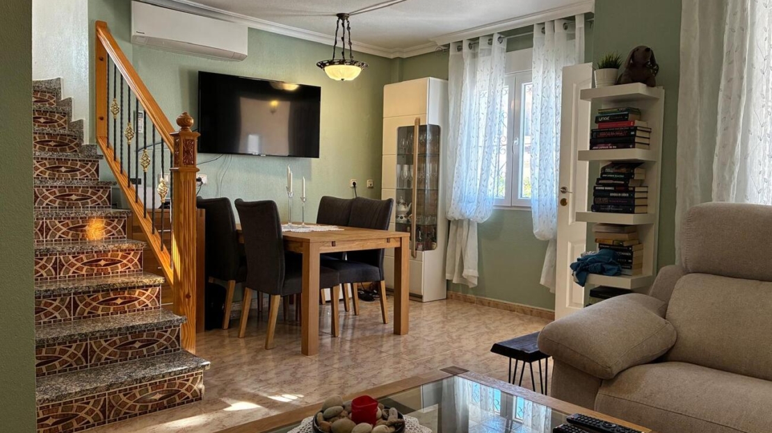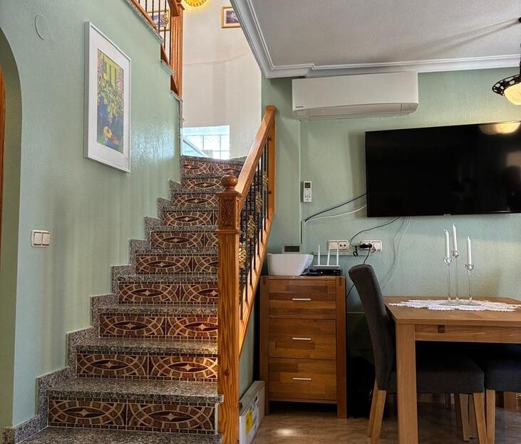Exclusively for sale with AT HOME Real EstateThis beautiful and well-maintained home is built over two levels and offers a comfortable and functional layout.On the ground floor, you will find a fully equipped kitchen open to the bright living area, along with a bedroom and a bathroom. Upstairs, there are two additional bedrooms—one of which features a private balcony—and a second bathroom. From this level, a terrace leads to the private solarium, where a storage room is currently used as an additional guest bedroom.The outdoor area is very inviting, offering several terraces, a private parking space, and enough room to install your own private swimming pool if desired.The property benefits from air conditioning in the living room and in one of the bedrooms and is sold fully furnished, making it ready to move into.The residential complex features a beautiful communal swimming pool and is ideally located within walking distance (approx. 1 km) to all amenities. Several golf courses are nearby, the stunning beaches of the Costa Blanca are just 6 km away, and Alicante Airport is approximately 55 km from the property.This home is perfect as a holiday retreat, permanent residence, or an excellent rental investment.