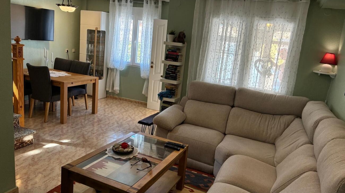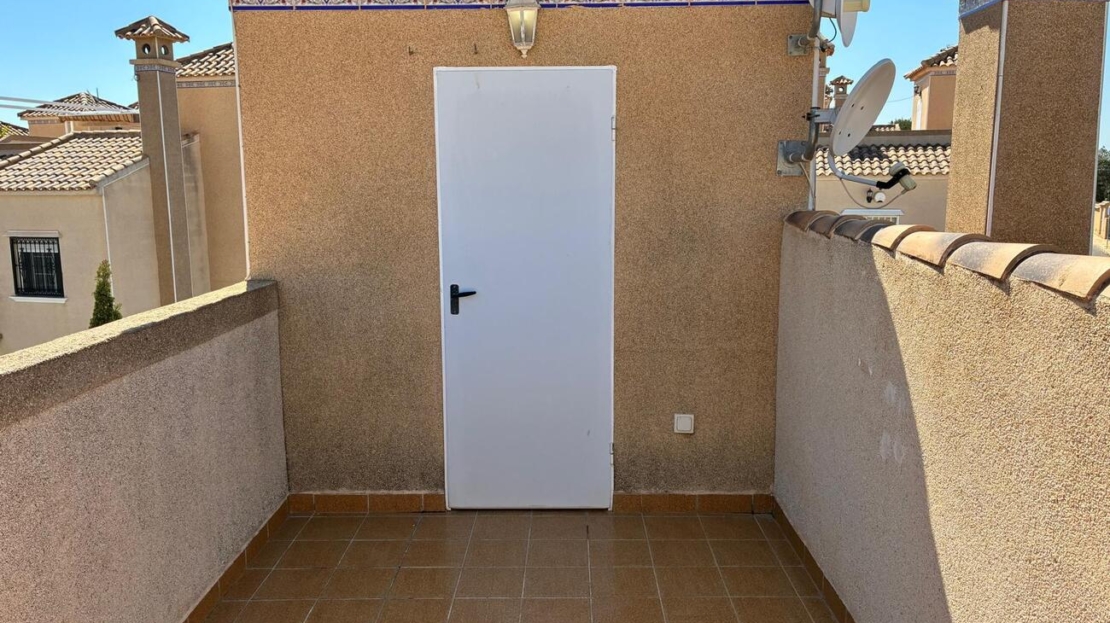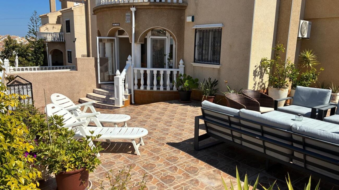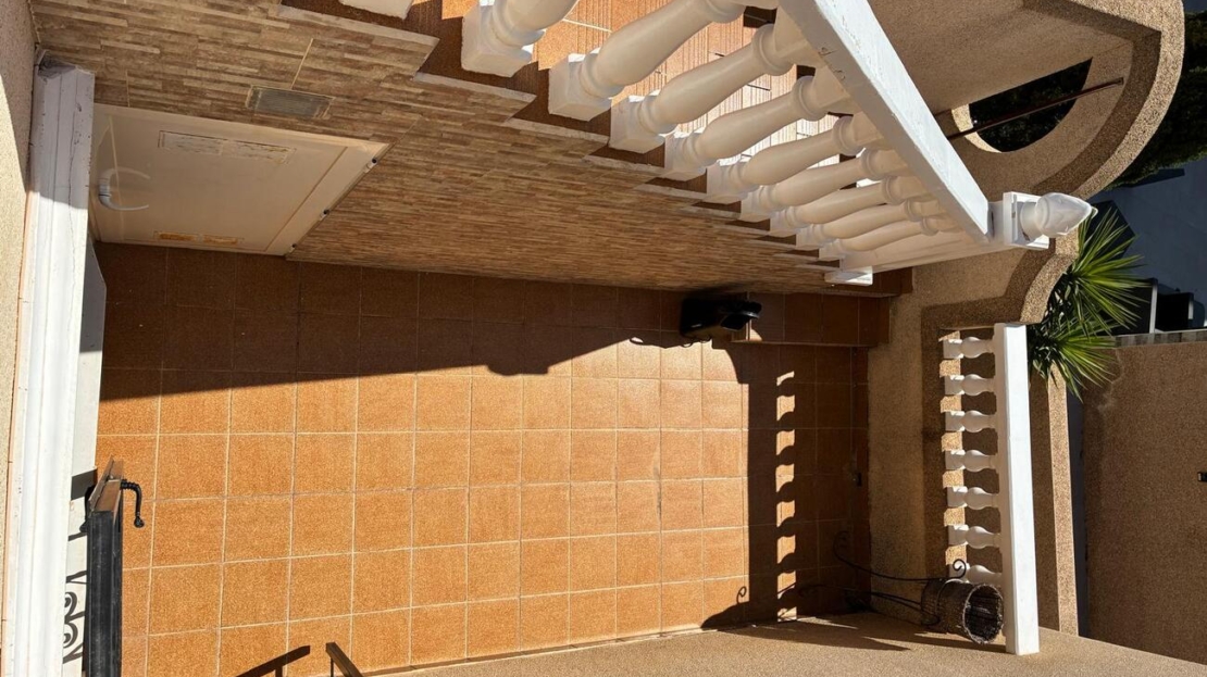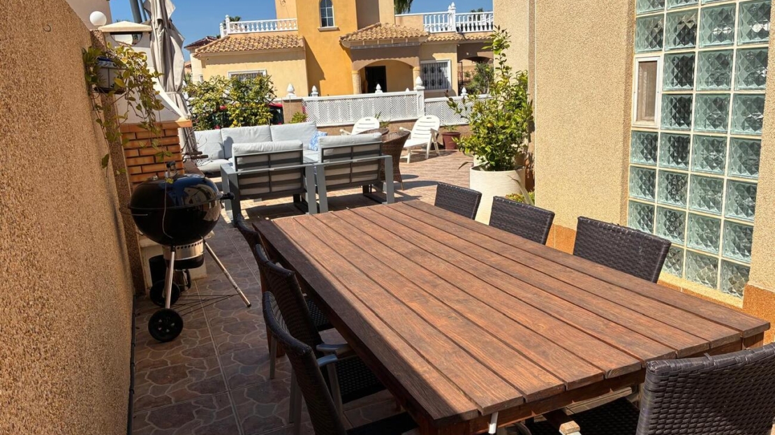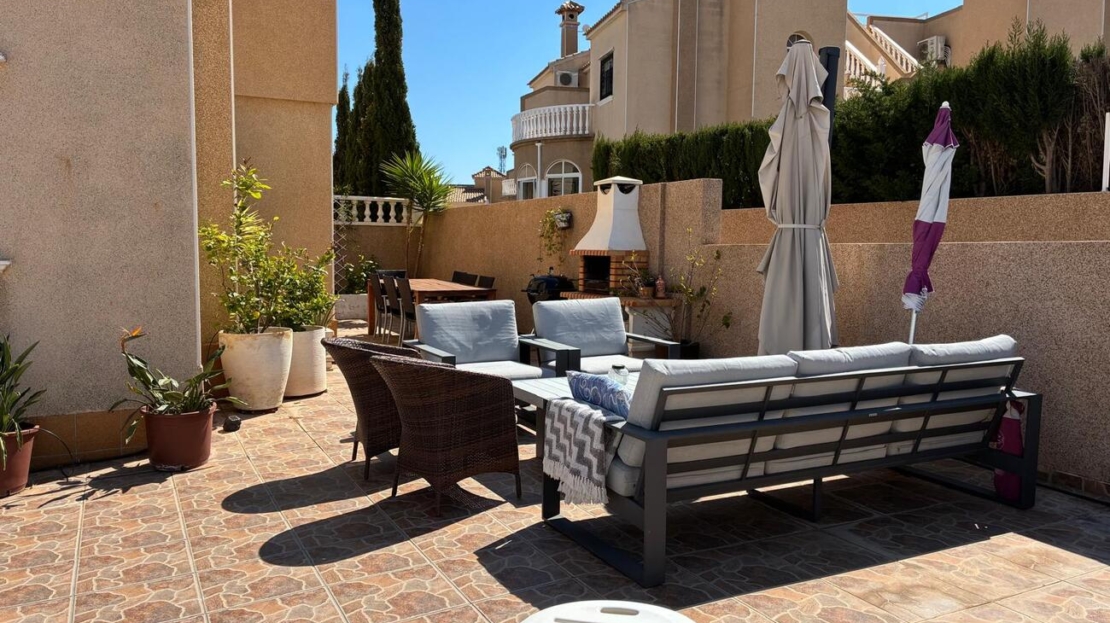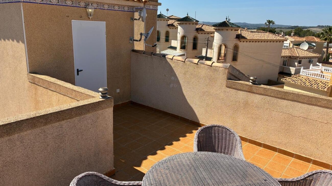 Exclusively for sale with AT HOME Real EstateThis beautiful and well-maintained home is built over two levels and offers a comfortable and functional layout.On the ground floor, you will find a fully equipped kitchen open to the bright living area, along with a bedroom and a bathroom. Upstairs, there are two additional bedrooms—one of which features a private balcony—and a second bathroom. From this level, a terrace leads to the private solarium, where a storage room is currently used as an additional guest bedroom.The outdoor area is very inviting, offering several terraces, a private parking space, and enough room to install your own private swimming pool if desired.The property benefits from air conditioning in the living room and in one of the bedrooms and is sold fully furnished, making it ready to move into.The residential complex features a beautiful communal swimming pool and is ideally located within walking distance (approx. 1 km) to all amenities. Several golf courses are nearby, the stunning beaches of the Costa Blanca are just 6 km away, and Alicante Airport is approximately 55 km from the property.This home is perfect as a holiday retreat, permanent residence, or an excellent rental investment.