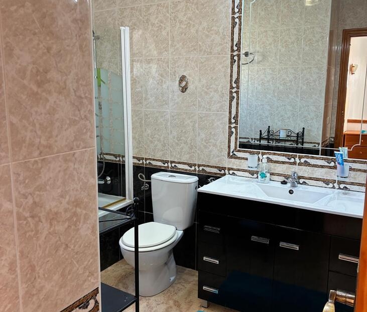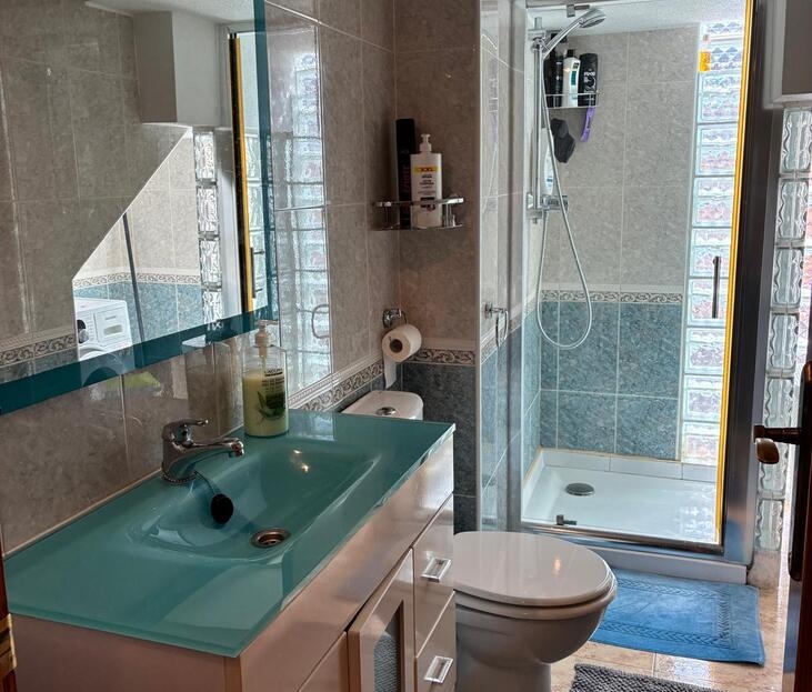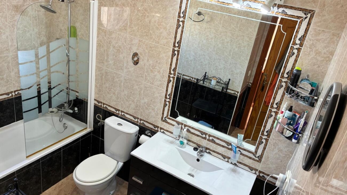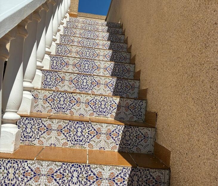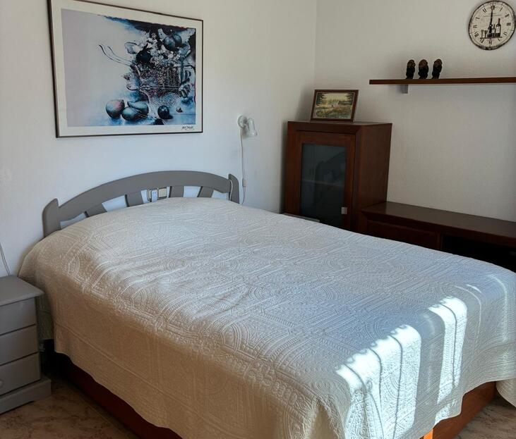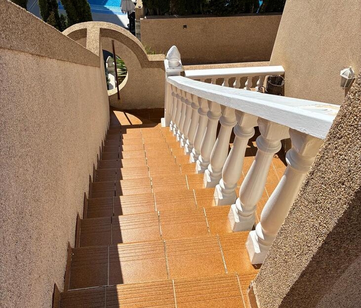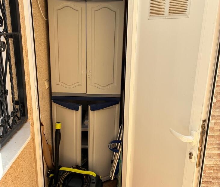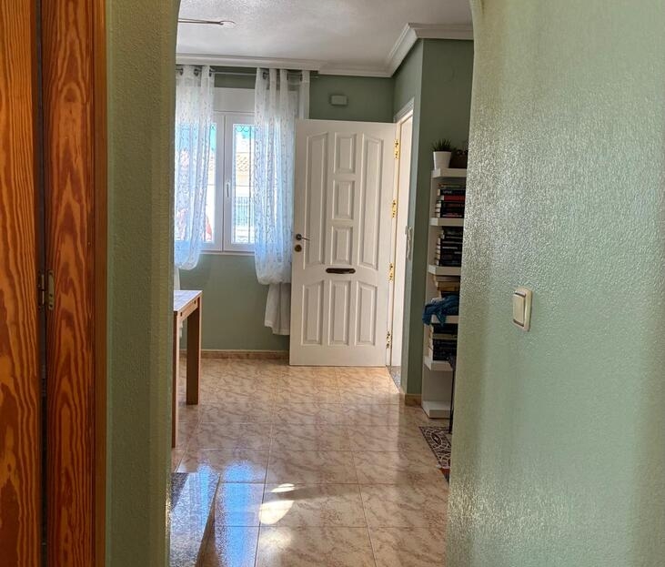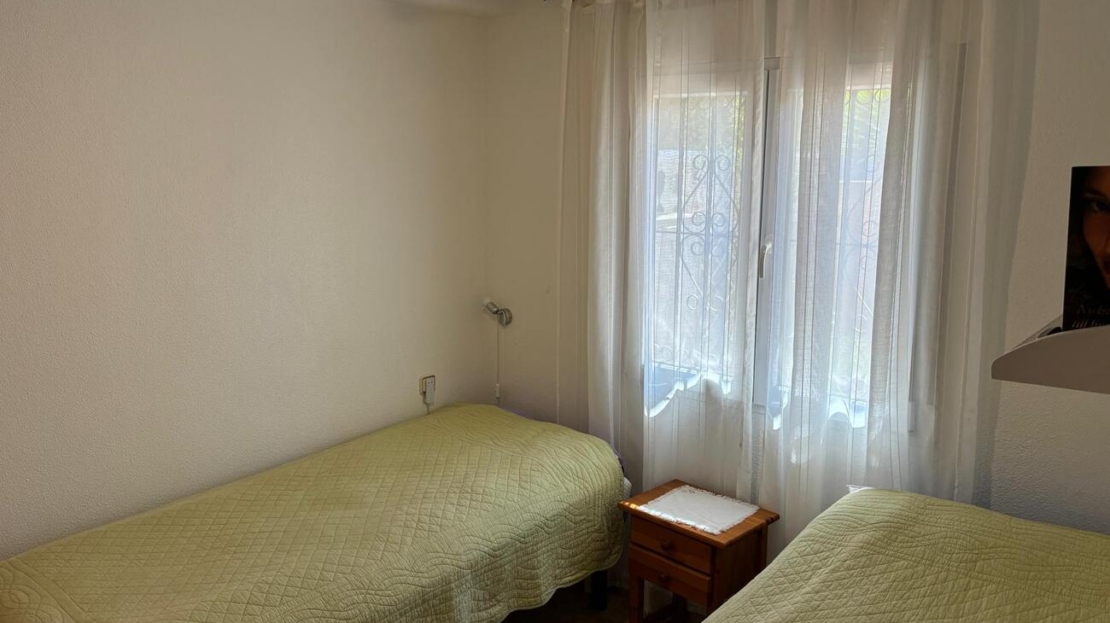 Exclusively for sale with AT HOME Real EstateThis beautiful and well-maintained home is built over two levels and offers a comfortable and functional layout.On the ground floor, you will find a fully equipped kitchen open to the bright living area, along with a bedroom and a bathroom. Upstairs, there are two additional bedrooms—one of which features a private balcony—and a second bathroom. From this level, a terrace leads to the private solarium, where a storage room is currently used as an additional guest bedroom.The outdoor area is very inviting, offering several terraces, a private parking space, and enough room to install your own private swimming pool if desired.The property benefits from air conditioning in the living room and in one of the bedrooms and is sold fully furnished, making it ready to move into.The residential complex features a beautiful communal swimming pool and is ideally located within walking distance (approx. 1 km) to all amenities. Several golf courses are nearby, the stunning beaches of the Costa Blanca are just 6 km away, and Alicante Airport is approximately 55 km from the property.This home is perfect as a holiday retreat, permanent residence, or an excellent rental investment.