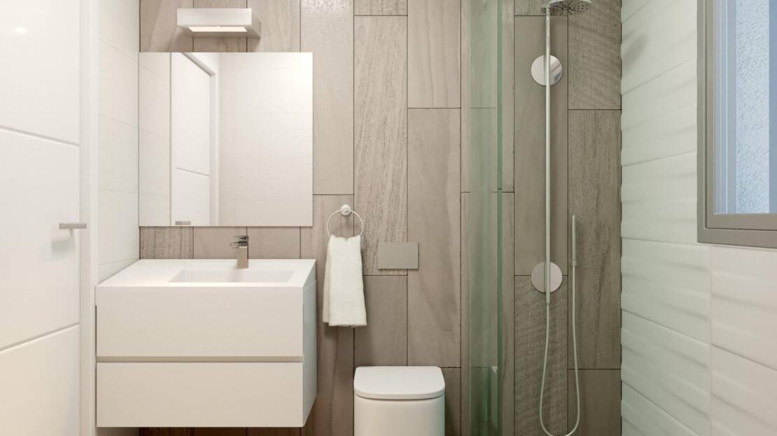 Salles de bains entièrement équipées, avec éléments muraux, miroir et pare-douche.