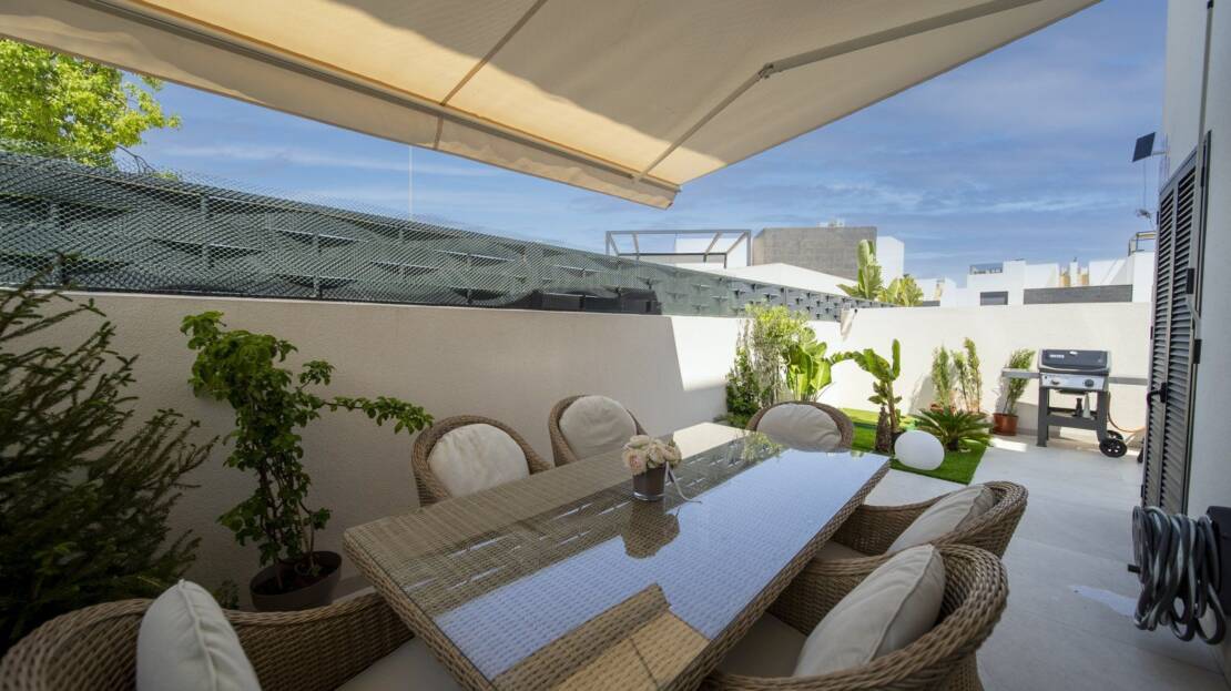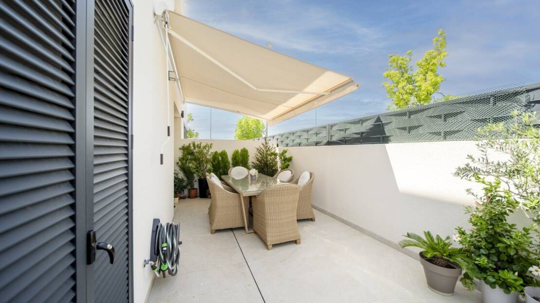 Terrasse avec store rétractable et accès à un solarium privé à l'étage