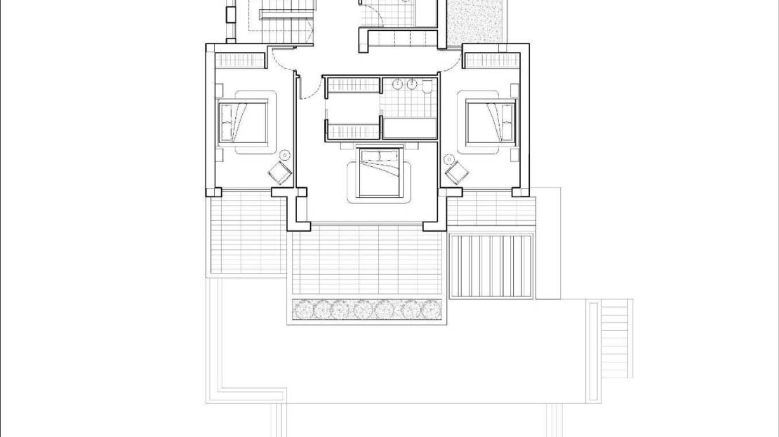 À l'extérieur, la villa dispose de plusieurs espaces de détente et de repas, d'un espace barbecue couvert d'une pergola et d'une piscine accueillante entourée d'un jardin luxuriant et de chaises longues. À l'étage supérieur, trois chambres supplémentaires (dont la suite parentale avec salle de bains privative et terrasse privée) ainsi qu'une deuxième terrasse offrant de belles vues.