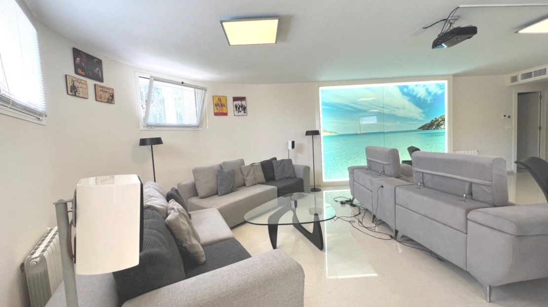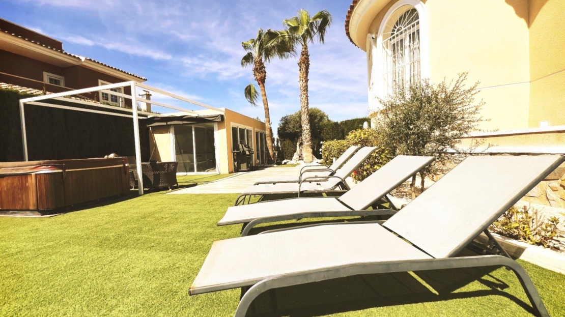 À l’extérieur, un grand jardin, une piscine et un jacuzzi, ainsi qu’une cuisine extérieure impressionnante transforment chaque moment en expérience unique. Cette villa est parfaite pour ceux qui recherchent une vie luxueuse près du golf et de la mer.