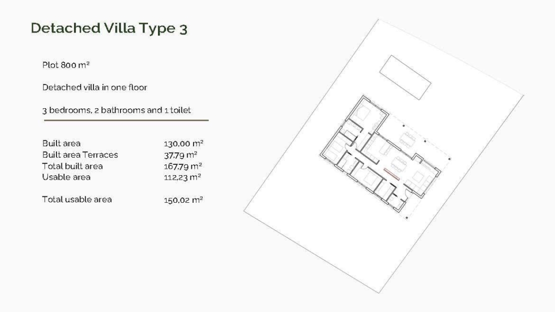 Chaque villa est située sur un terrain privé de 800 m² et est distribuée sur un seul étage, offrant un maximum de confort et d'accessibilité. Choisissez parmi 5 configurations différentes avec 3 ou 4 chambres, 2 ou 3 salles de bains et des surfaces construites allant de 130 à 178 m². Toutes les maisons disposent de grandes terrasses couvertes, idéales pour profiter de la vie en plein air tout au long de l'année.