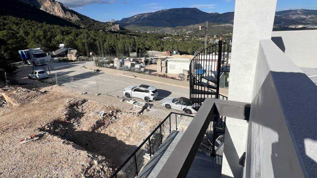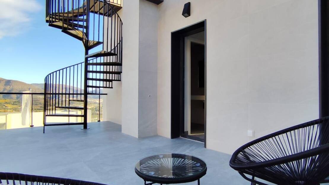 Nouvelle construction de villas jumelées avec plusieurs terrasses et solarium, entièrement clôturées, avec parking pour véhicules et piscine privée à Polop.