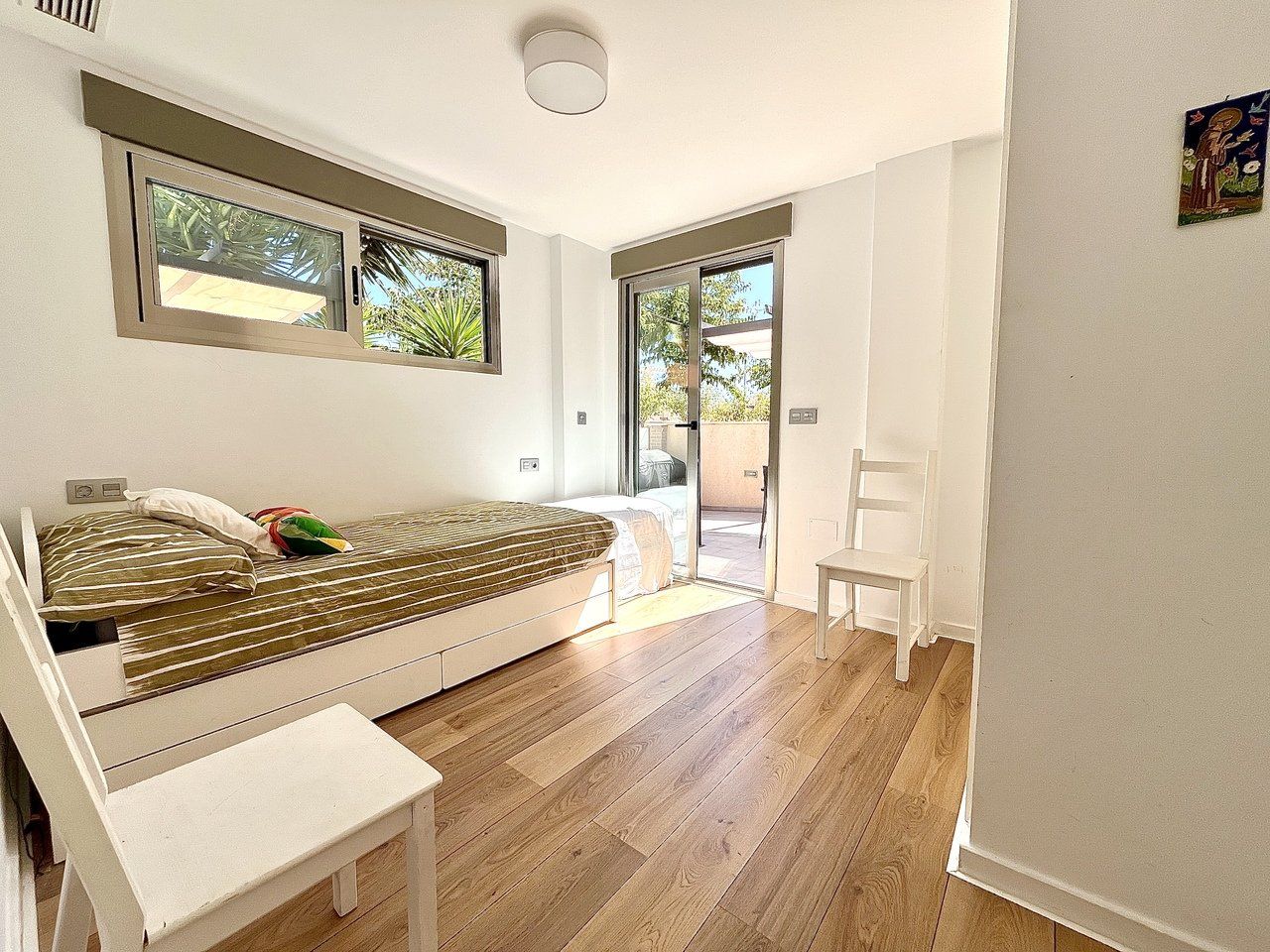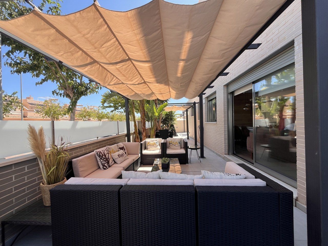 Step into modern coastal living with this exceptional 4 bedroom, 4 bathroom semi-detached home in the sought-after Torre de la Horadada. Located just 800 metres from pristine beaches, this property offers a rare combination of style, convenience, and Mediterranean charm. A short stroll takes you to the vibrant Nueva Plaza, filled with bars, restaurants, and local services, while the well-known main plaza is just two minutes away. For golf lovers, Lo Romero Golf Course is only a 15-minute drive.Sold fully furnished and ready to move into, this home is designed for effortless living. The open, light-filled spaces lead onto a large wraparound terrace with all-day sun, a private solarium with stunning sea views, pristine communal pool that can be accessed directly from the street — perfect for coming back from the beach and enjoying a swim without entering the house.. Every detail has been considered, from electric blinds with an automated security system in every room, to air conditioning throughout, built-in wardrobes, and two beautifully appointed en-suite bedrooms. The bathrooms feature underfloor heating for a touch of luxury all year round.With its unbeatable location just metres from the beach, top-quality finishes, and thoughtful design, this property is everything you need to enjoy your dream life on the Costa Blanca.