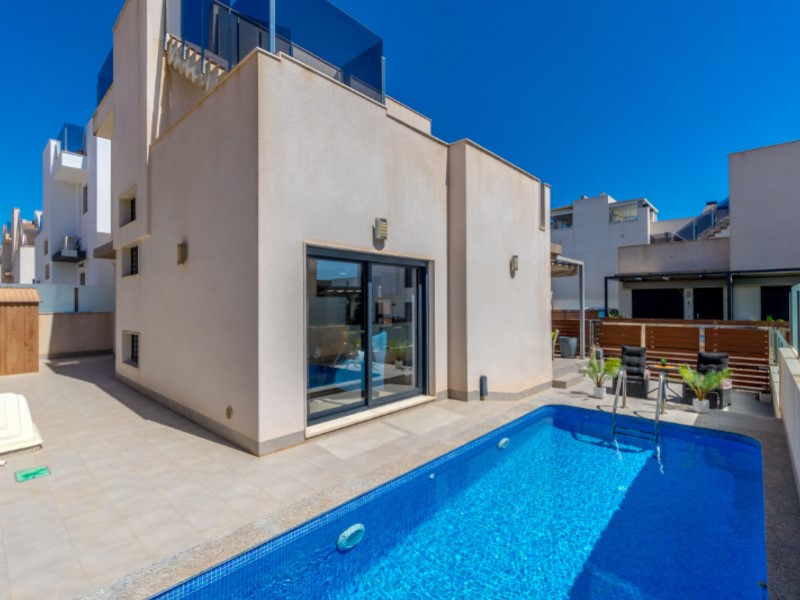 Il s'agit vraiment d'une magnifique villa moderne avec 5 chambres et 3 salles de bains, avec un terrain spacieux et une piscine privée en terrasse accueillante, conçue pour la famille moderne. La maison est située dans une petite urbanisation fermée avec seulement 18 maisons, était prête à être occupée en 2017. La communauté de propriétaires de ce développement autorise les locations, donc si vous recherchez une maison que vous pouvez également louer lorsque vous ne l'utilisez pas, c'est le choix parfait.Lorsque vous entrez dans cette élégante maison, vous serez accueilli par un espace de vie ouvert, avec un salon impressionnant avec de grandes fenêtres, une cuisine ouverte qui est également entièrement équipée et avec un espace de rangement généreux. À cet étage, nous trouvons également une chambre avec une armoire sur mesure, une salle de bain luxueuse avec douche et une buanderie très pratique, avec accès direct au jardin derrière la maison.À l'étage supérieur, il y a deux autres chambres avec placards intégrés, une belle salle de bain avec douche et une grande et spacieuse terrasse, de cette terrasse il y a un escalier jusqu'à la belle terrasse sur le toit, avec de superbes vues sur la ville de Torrevieja et le célèbre lac salé.Mais cela ne s'arrête pas là, il y a aussi un sous-sol, ici il y a 2 chambres plus spacieuses, une salle de bain élégante avec douche et un grand salon qui sert actuellement de salon supplémentaire.Sur le terrain, il y a une belle piscine, avec une pompe à chaleur installée si vous préférez une température de l'eau confortable même en hiver.Plusieurs espaces extérieurs, ici vous pouvez vous déplacer de ou vers le soleil, derrière la maison il y a aussi une grande pièce de rangement pratique. La villa dispose d'équipements modernes, y compris une climatisation avancée, pour un environnement intérieur encore meilleur, un système de ventilation très efficace par des conduits a été installé et des stores électriques automatisés. Tout le rez-de-chaussée est alimenté par un système domotique sophistiqué. Des moustiquaires sont installées dans la chambre principale et la salle de bain au 2e étage, la grande porte coulissante en verre au 2e étage et la porte d'entrée principale.Il y a un système de détartrage et d'eau potable dans la cuisine et la salle de bain au deuxième étage. L'eau chaude est chauffée efficacement par des panneaux solaires. La propriété est vendue entièrement meublée et équipée, prête à emménager directement.Parking sur le terrain.À quelques minutes à pied, vous trouverez une variété de magasins tels que l'épicerie, la boulangerie, l'optique, les cafés pour n'en nommer que quelques-unsÀ 10-12 minutes à pied, vous trouverez le célèbre marché du vendredi, le parc aquatique et de grandes installations sportives, mais vous pouvez les utiliser.Liaisons en bus dans la région, qui vous emmènent, entre autres. centre de Torrevieja ou la plage de La Mata pour ceux qui ne veulent pas marcher.TorreviejaTorrevieja est une ville de la province d'Alicante dans la région Communauté valencienne en Espagne. La ville est une destination touristique populaire située à environ 40 minutes en voiture de la métropole d'Alicante et de l'aéroport. Torrevieja était à l'origine un petit village de pêcheurs, et est aujourd'hui l'un des plus grands producteurs de sel d'Europe, Torrevieja a été appelée la « ville du sel », mais ces dernières années, la ville a également été nommée « ville sportive », ceci en raison des grandes arènes sportives qui ont été construites ces dernières années. Grâce à cet investissement fantastique, Torrevieja est devenue l'une des quatre villes hôtes du Championnat du monde de handball féminin 2021.Lorsque vous habitez à Torrevieja, vous êtes à une courte distance de marche des plages de sable blanc allongées avec le tampon « drapeau bleu », comme une indication, entre autres, de la haute qualité de l'eau. Dans les environs immédiats et souvent « juste devant » la porte, vous trouverez un grand choix de magasins locaux, de restaurants, de cafés, de centres commerciaux, de parcs verdoyants, du port et de la promenade. Si vous êtes à la recherche d'une région où la vie dure toute l'année et d'un microclimat sain avec 320 jours de soleil par an, celle-ci est peut-être faite pour vous.Économie:Prix suggéré : 439.000€ + coût d'environ 12 %Charges communes : environ 200€ par anIBI/Impôts : 481.92 par anContactez-nous dès aujourd'hui et nous vous en dirons plus.