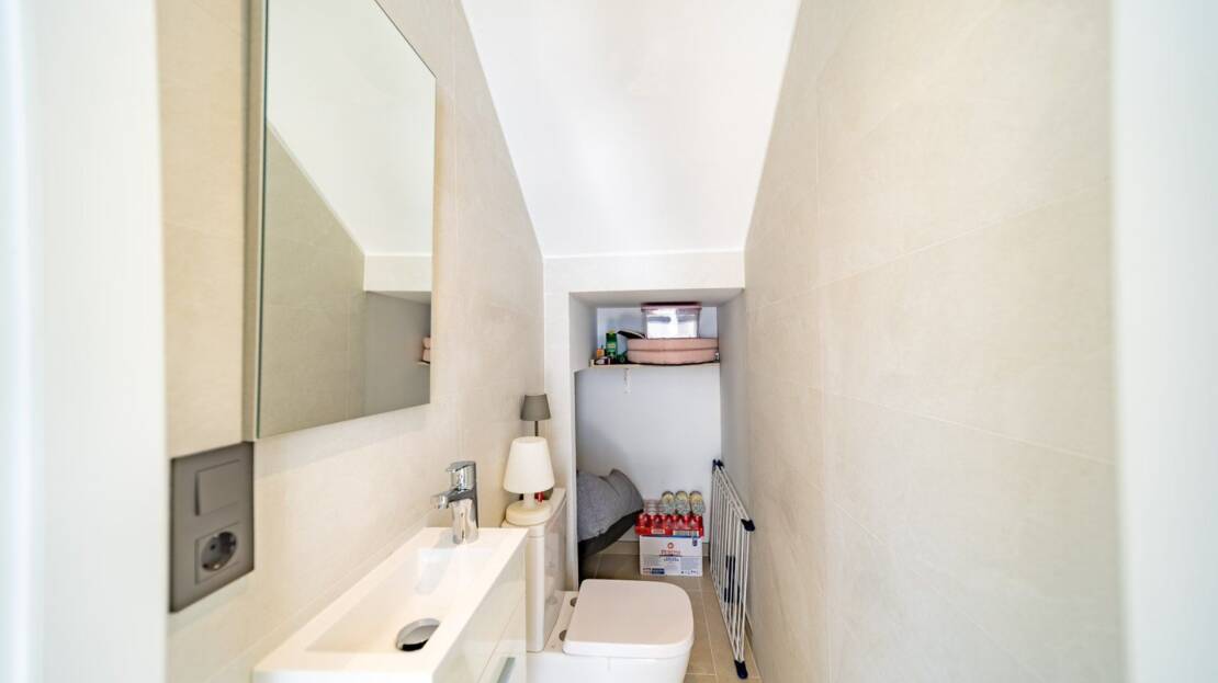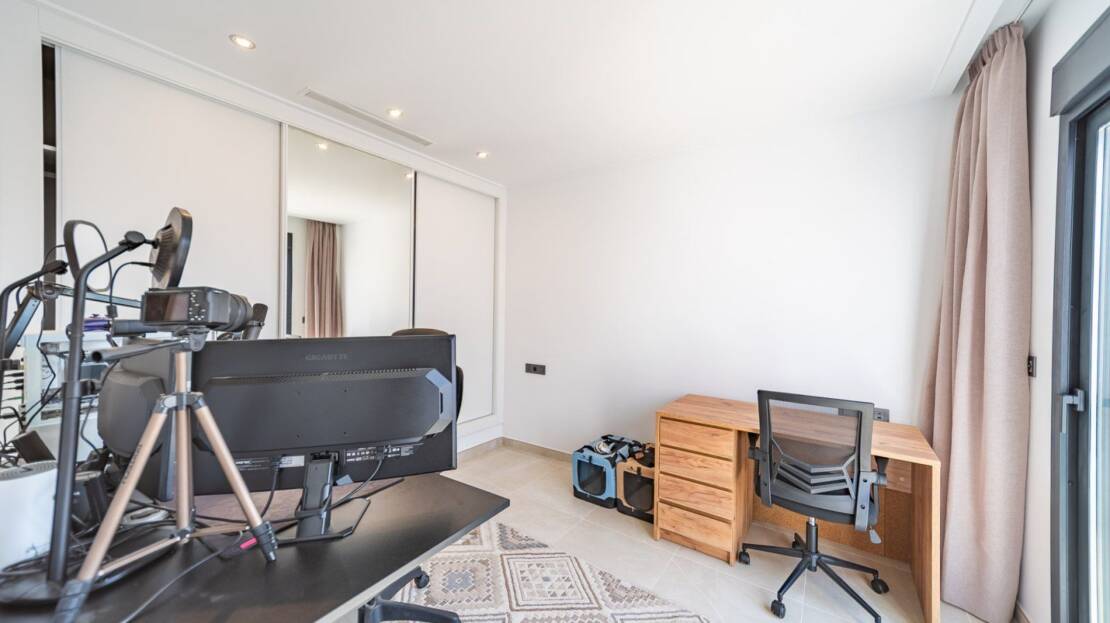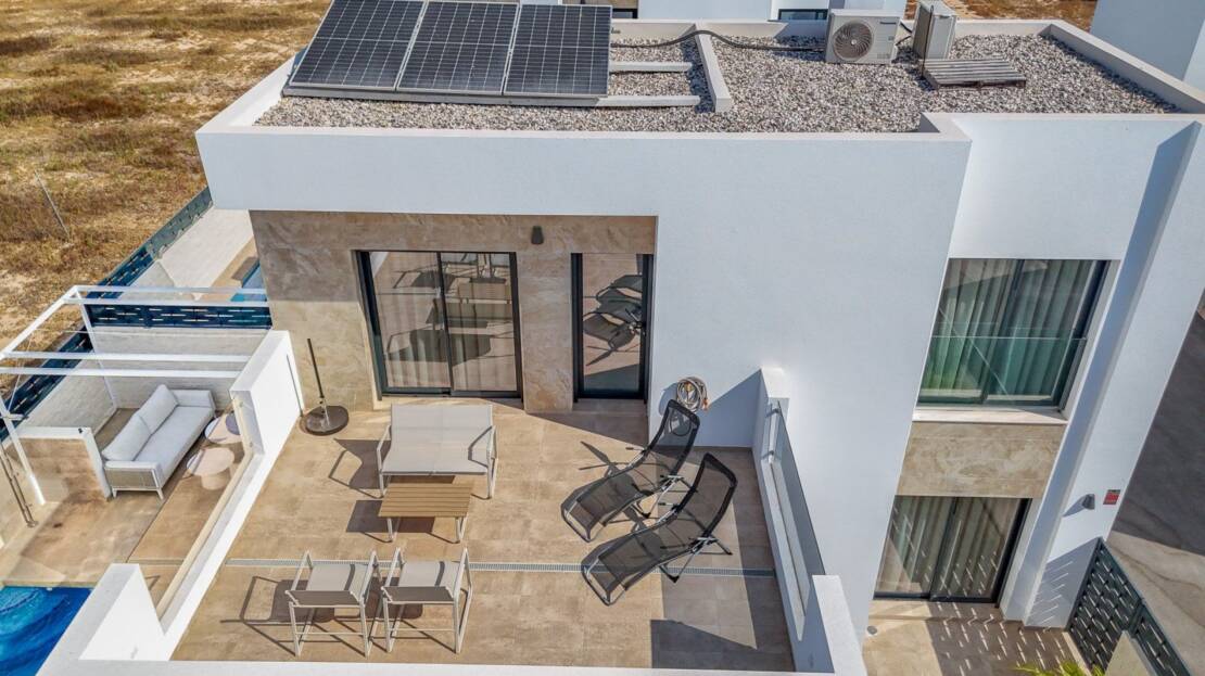 À l’étage supérieur, on trouve deux chambres supplémentaires, une salle de bains complète et une terrasse ensoleillée. La villa dispose d’une piscine privée chauffée (7x2,5 m), d’un débarras, de la climatisation centralisée par étage, de panneaux solaires, d’un store électrique et de meubles de haute qualité. La propriété est en excellent état et a été construite en 2024.