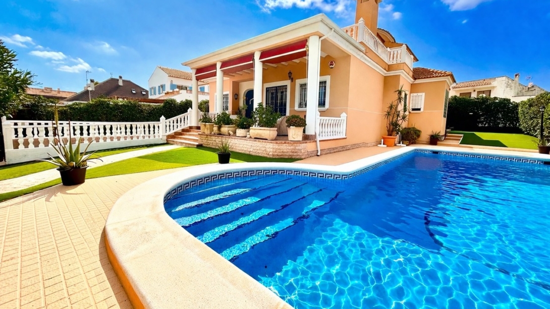 This magnificent luxury villa is set on an approximate 800 m² plot and offers a generous 440 m² of built space, distributed over two main floors plus a fully equipped semi-basement level arranged as additional living accommodation.The property features six spacious double bedrooms and five fully fitted bathrooms, making it ideal for large families, entertaining guests, or even as a high-end holiday retreat. The interior boasts a large independent kitchen with direct access to the garden, as well as bright and elegant living and dining areas on each floor, providing versatile spaces for both everyday comfort and hosting gatherings.A true highlight of this home is its exceptional location just a few steps from La Mata Beach, allowing you to enjoy the Mediterranean coastline, beachfront restaurants, and scenic walks within moments of leaving your front door. Outside, the villa offers a stunning private swimming pool surrounded by a lush, mature garden—perfect for relaxing in complete privacy. A welcoming covered porch and a pergola with built-in barbecue create the perfect setting for outdoor dining and memorable family or social events. For year-round comfort and security, the property is equipped with a comprehensive alarm system, central heating, and air conditioning throughout.This is a rare opportunity to own a spacious, well-appointed villa in one of the most desirable coastal areas, combining generous living space, beautiful outdoor areas, and unbeatable proximity to the beach.