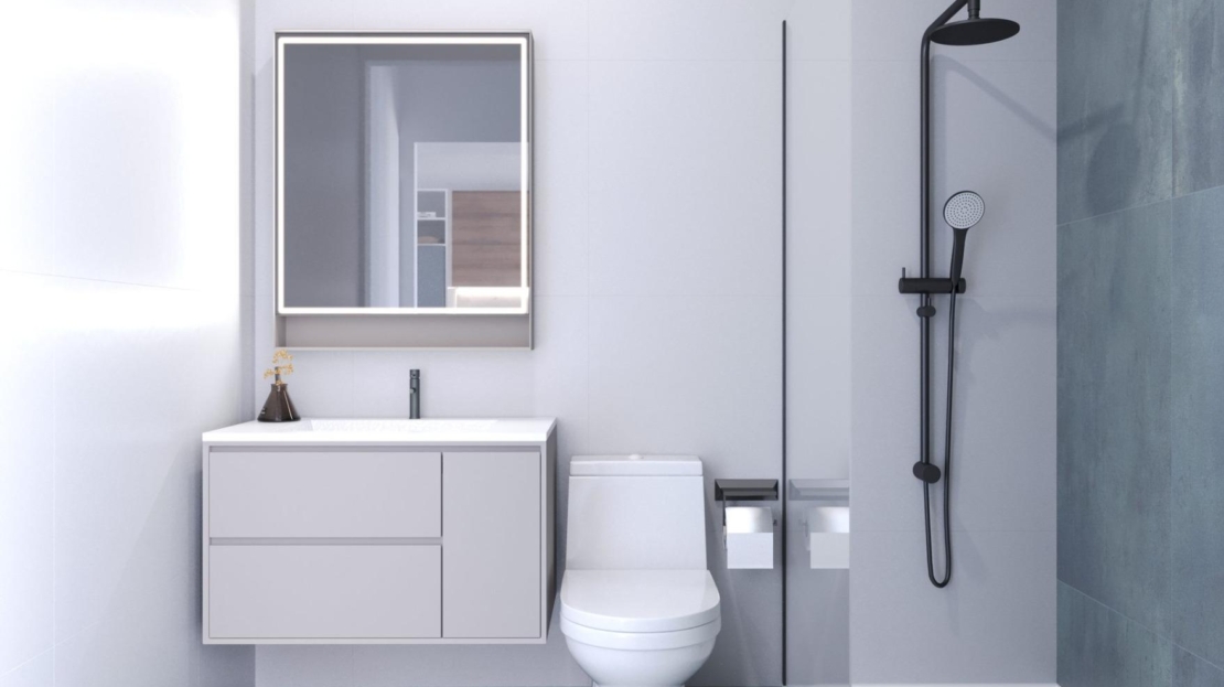 Salles de bains avec meubles-lavabos, miroirs, éclairage et parois de douche