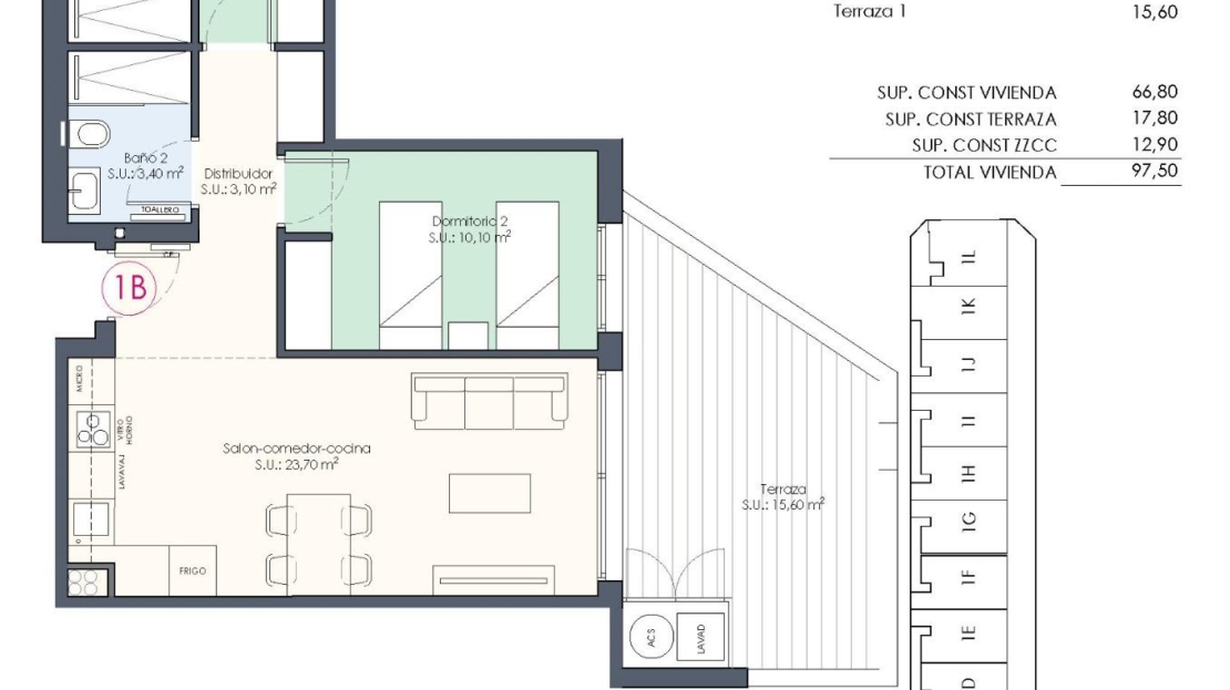 Boligkomplekset består av 35 leiligheter og toppleiligheter med 2, 3 og 4 soverom og 2 bad, åpen kjøkkenløsning med stue, garderober og terrasser.