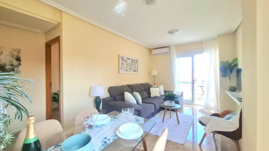 Leilighet beliggende midt i sentrum av Torrevieja, kun 1 km fra Playa del Cura. Den har 60 m² bebygd areal, fordelt på 2 soverom, 1 bad, åpen kjøkkenløsning og stue med utgang til en terrasse med nordøstorientering.