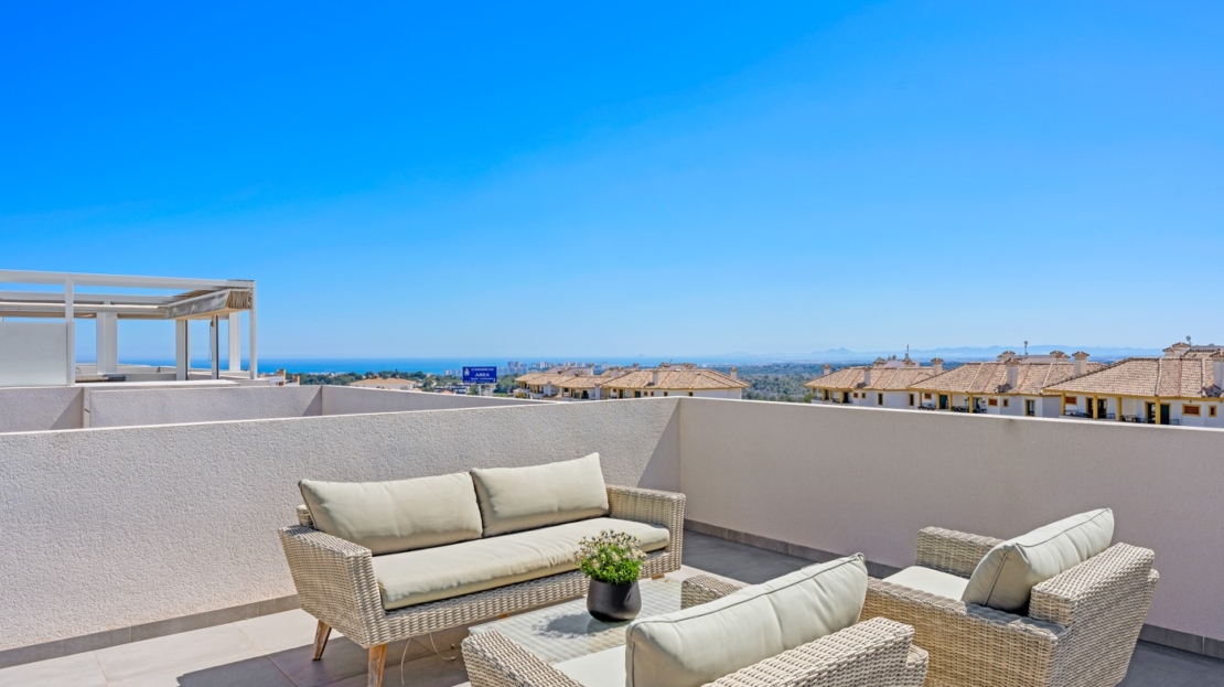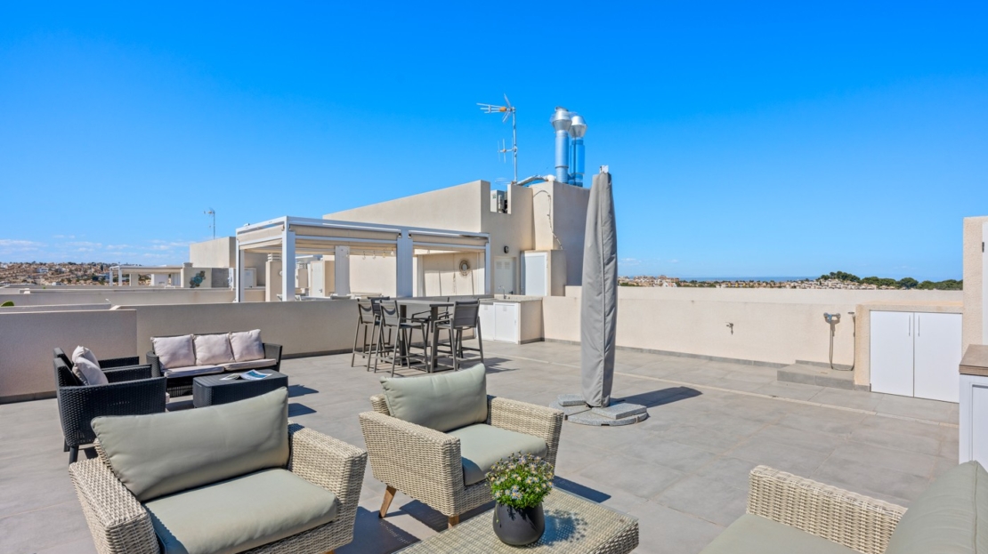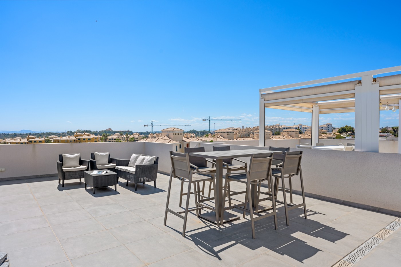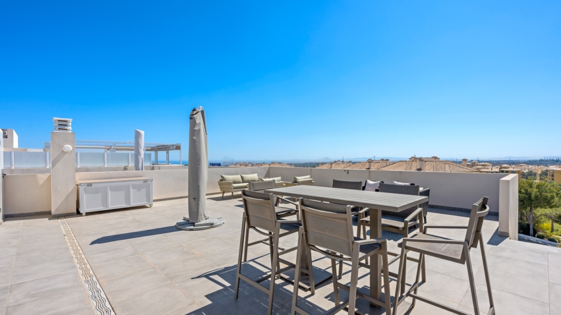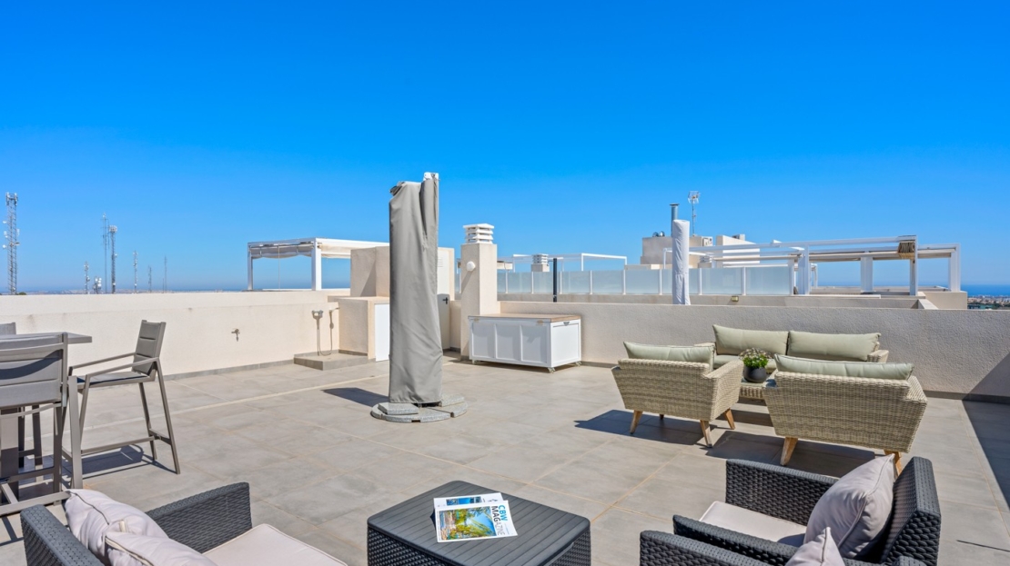 Discover this beautiful penthouse in a recent new-build development located in the sought-after area of Campoamor, Orihuela Costa, specifically close to Villamartín. This privileged location is surrounded by three excellent golf courses (Villamartín, Las Ramblas and Campoamor) and offers stunning distant sea views, while shops, restaurants and all amenities are within walking distance.The penthouse enjoys sunshine all day long and features a very spacious terrace, ideal for making the most of outdoor living and the views. In addition, there is a private solarium where you can relax in peace with panoramic views, even of the sea.The property is sold fully furnished and finished to high quality standards, including air conditioning and underfloor heating in the bathrooms. It also includes a private underground parking space and a practical storage room.The residential complex offers a beautiful communal garden with palm trees and various plants, as well as a swimming pool and jacuzzi—perfect for relaxing in a pleasant and green environment.Thanks to its excellent location, you are only 10 minutes away from the beautiful beaches of Campoamor and Cabo Roig, and close to the popular Zenia Boulevard shopping centre. Alicante and Murcia airports are easily accessible within approximately 45 minutes.This penthouse is the ideal investment, both for holidays and permanent living, where comfort, luxury and location come together perfectly.
