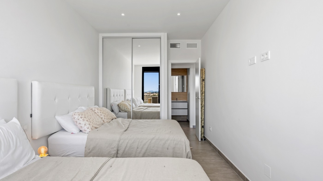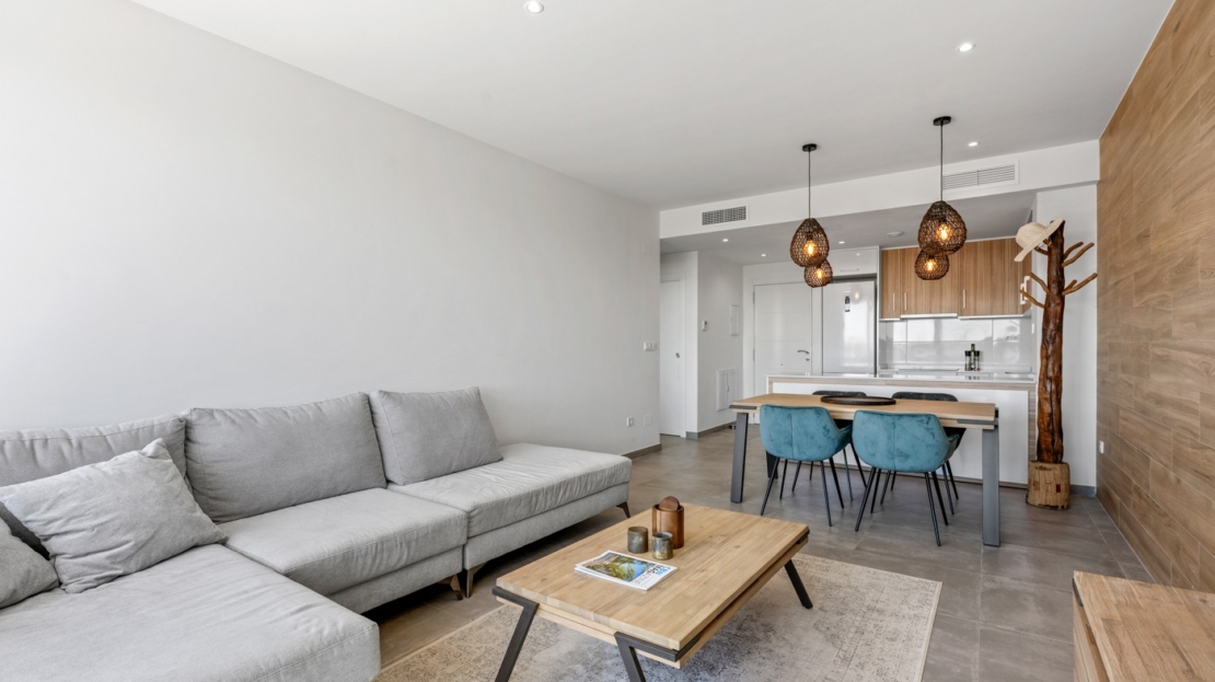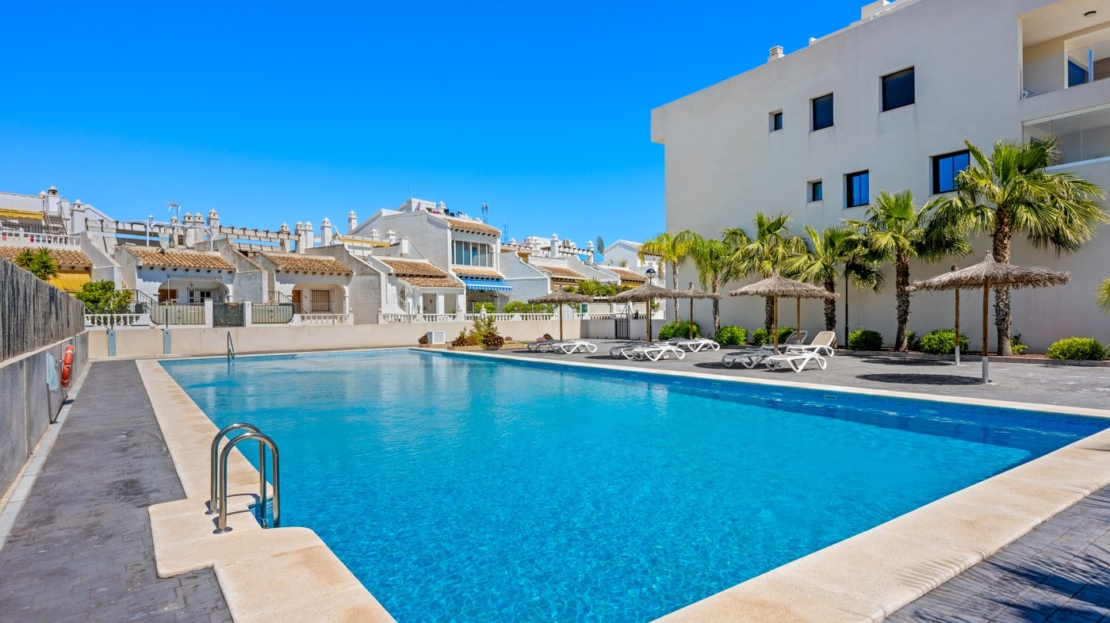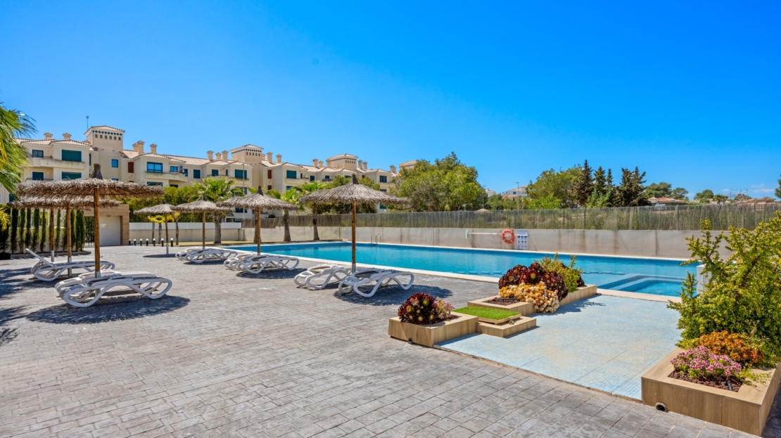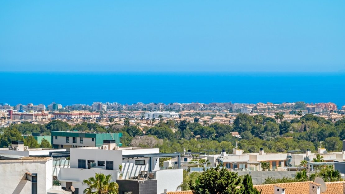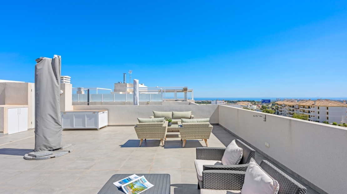 Discover this beautiful penthouse in a recent new-build development located in the sought-after area of Campoamor, Orihuela Costa, specifically close to Villamartín. This privileged location is surrounded by three excellent golf courses (Villamartín, Las Ramblas and Campoamor) and offers stunning distant sea views, while shops, restaurants and all amenities are within walking distance.The penthouse enjoys sunshine all day long and features a very spacious terrace, ideal for making the most of outdoor living and the views. In addition, there is a private solarium where you can relax in peace with panoramic views, even of the sea.The property is sold fully furnished and finished to high quality standards, including air conditioning and underfloor heating in the bathrooms. It also includes a private underground parking space and a practical storage room.The residential complex offers a beautiful communal garden with palm trees and various plants, as well as a swimming pool and jacuzzi—perfect for relaxing in a pleasant and green environment.Thanks to its excellent location, you are only 10 minutes away from the beautiful beaches of Campoamor and Cabo Roig, and close to the popular Zenia Boulevard shopping centre. Alicante and Murcia airports are easily accessible within approximately 45 minutes.This penthouse is the ideal investment, both for holidays and permanent living, where comfort, luxury and location come together perfectly.