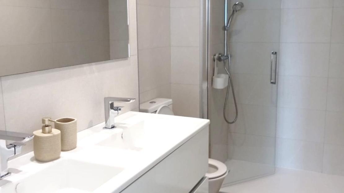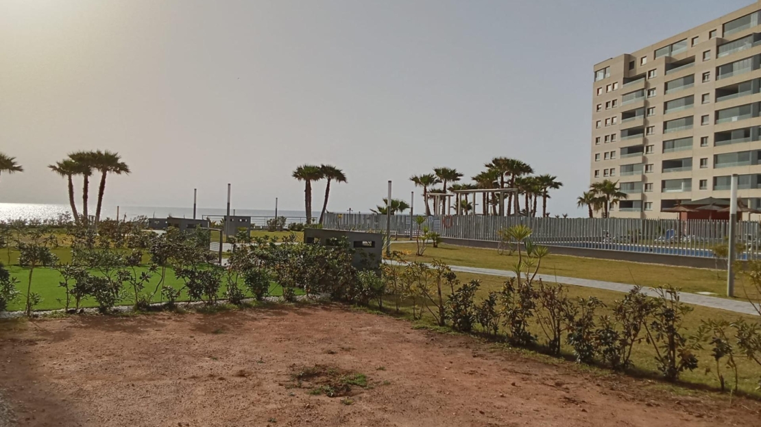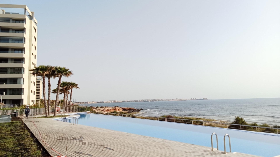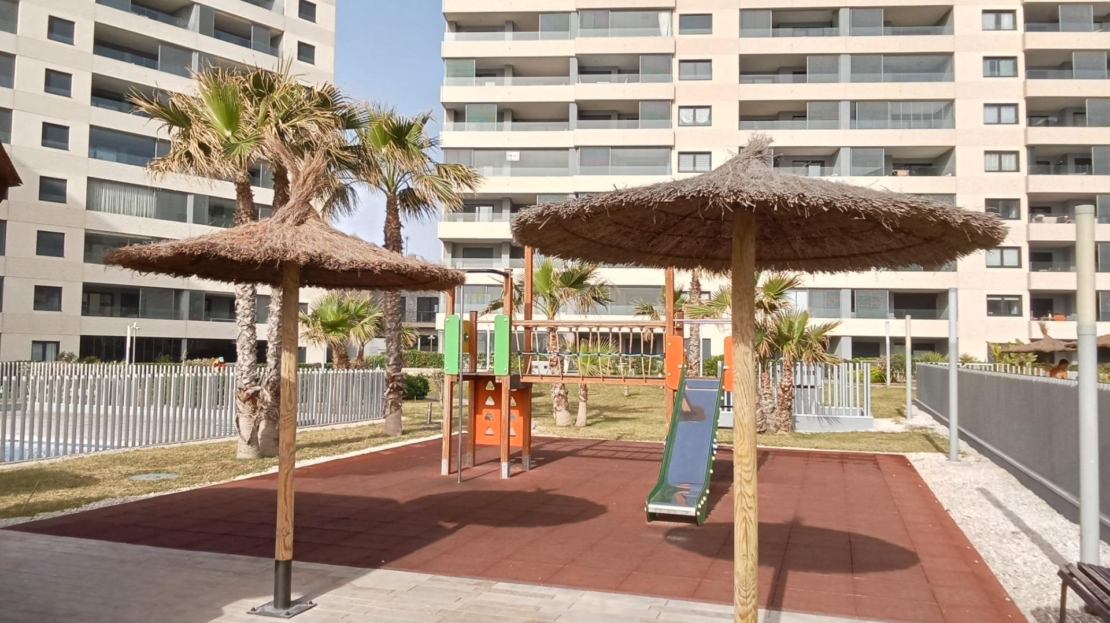 Ground floor apartment with elegant and modern design, like-new apartment, a few steps from the sea in Punta Prima! It consists of a living room with an open kitchen with access to the large covered terrace (approximately 16 m2) and the garden (approximately 65 m2), two double bedrooms with built-in wardrobes, two bathrooms and an underground parking space with a storage room in the same building. The main bedroom has an en suite bathroom and access to the terrace. Furnished. Equipped kitchen. Ducted air conditioning and heating. Bathrooms with underfloor heating. Video intercom. South facing. Top-quality materials. Direct elevators access from the apartment to the parking and storage units. Concierge and video surveillance. Residential with 3 swimming pools (Infinity, heated and children’s pools) with sea views, outdoor jacuzzi, children’s play areas and gardens. Close to all amenities, cafes, supermarkets, … A luxury! With a privileged location, a few steps from the sea, perfect to enjoy the beach and the great Mediterranean climate