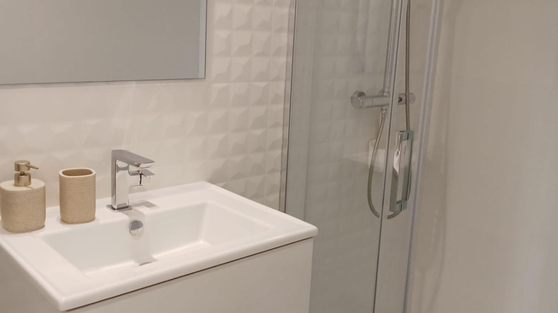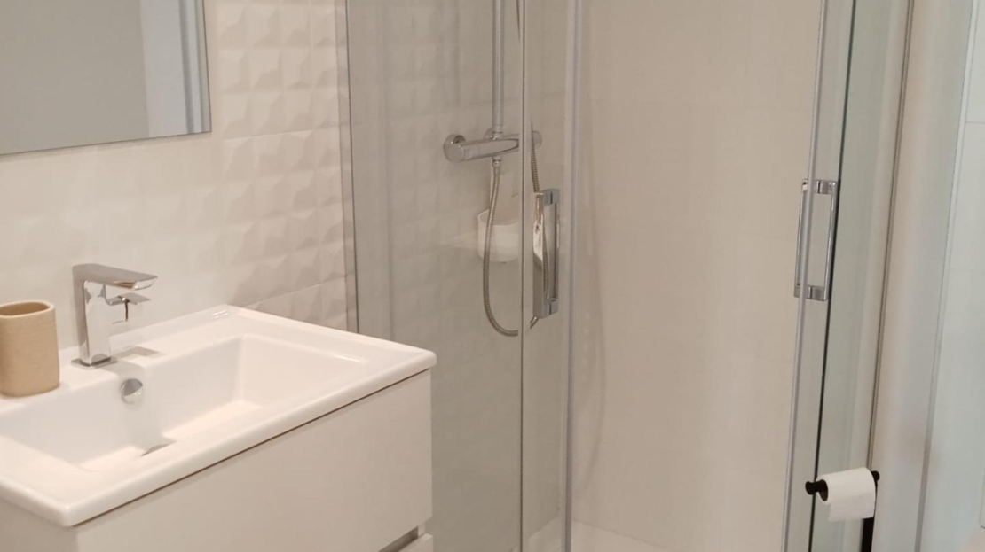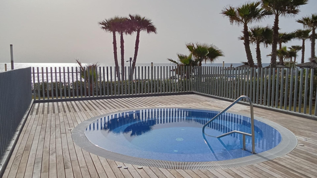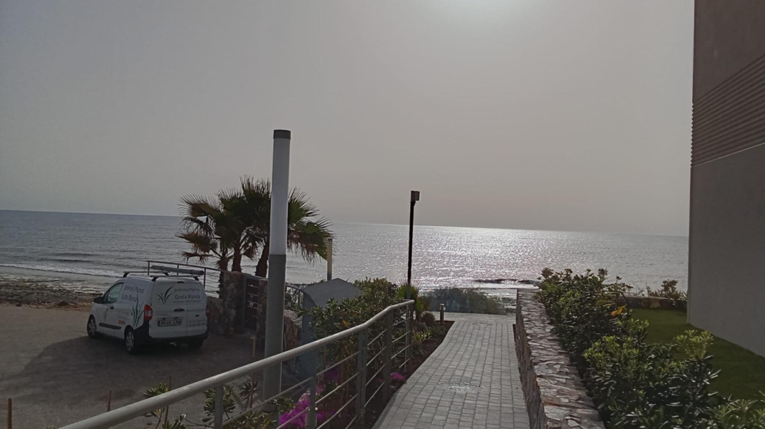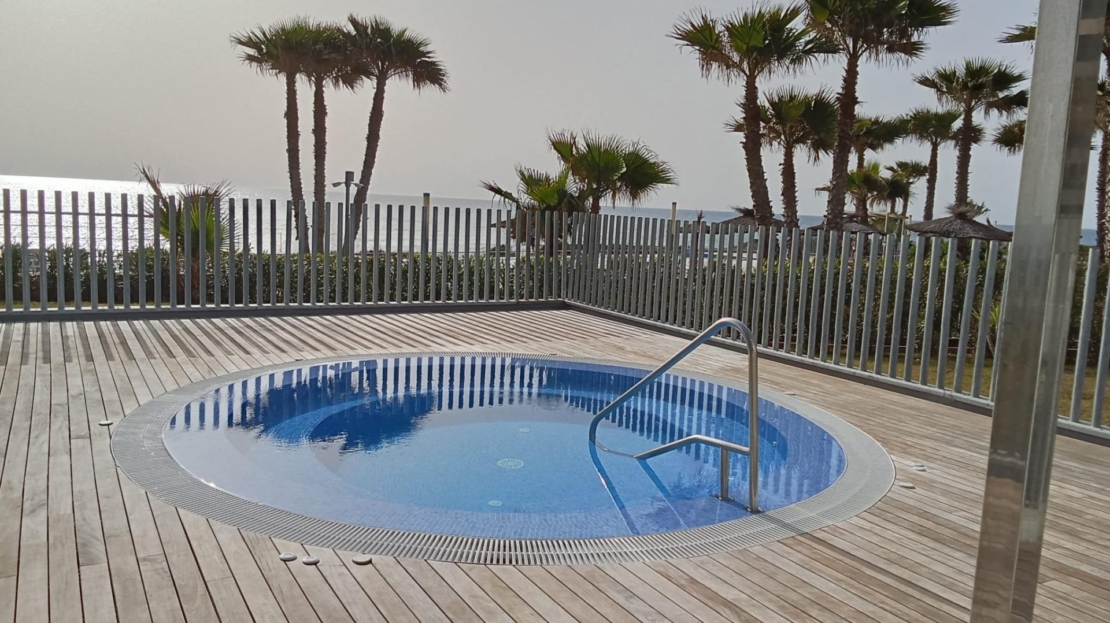 Ground floor apartment with elegant and modern design, like-new apartment, a few steps from the sea in Punta Prima! It consists of a living room with an open kitchen with access to the large covered terrace (approximately 16 m2) and the garden (approximately 65 m2), two double bedrooms with built-in wardrobes, two bathrooms and an underground parking space with a storage room in the same building. The main bedroom has an en suite bathroom and access to the terrace. Furnished. Equipped kitchen. Ducted air conditioning and heating. Bathrooms with underfloor heating. Video intercom. South facing. Top-quality materials. Direct elevators access from the apartment to the parking and storage units. Concierge and video surveillance. Residential with 3 swimming pools (Infinity, heated and children’s pools) with sea views, outdoor jacuzzi, children’s play areas and gardens. Close to all amenities, cafes, supermarkets, … A luxury! With a privileged location, a few steps from the sea, perfect to enjoy the beach and the great Mediterranean climate