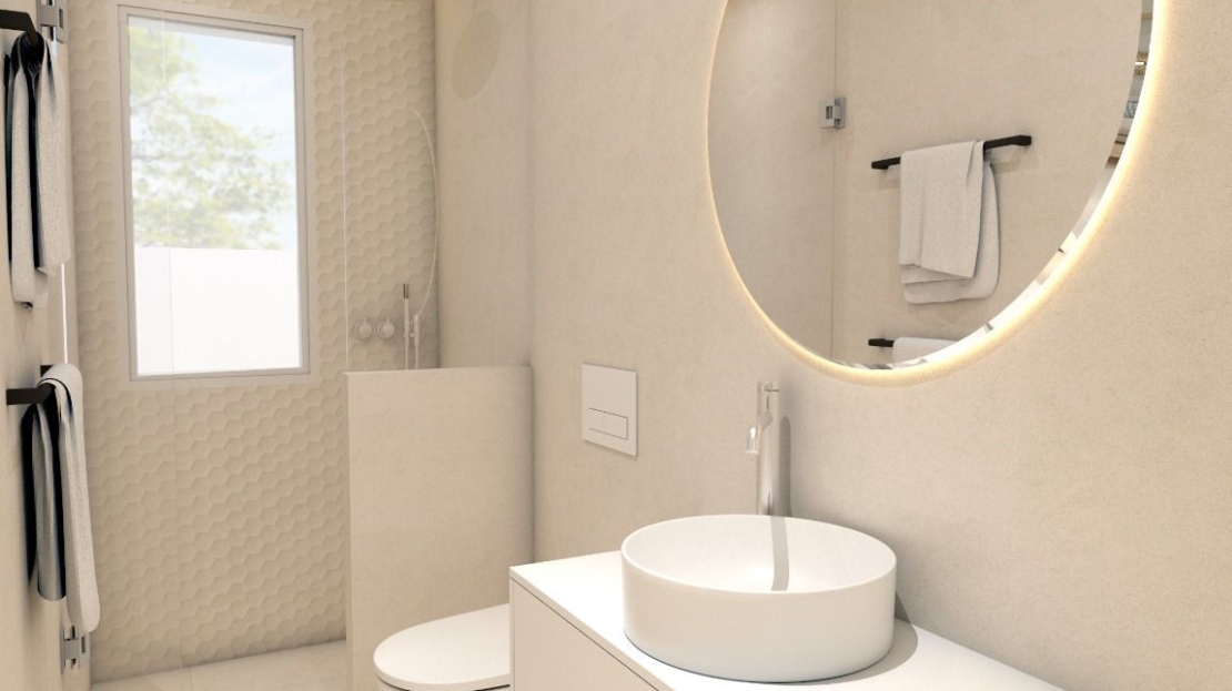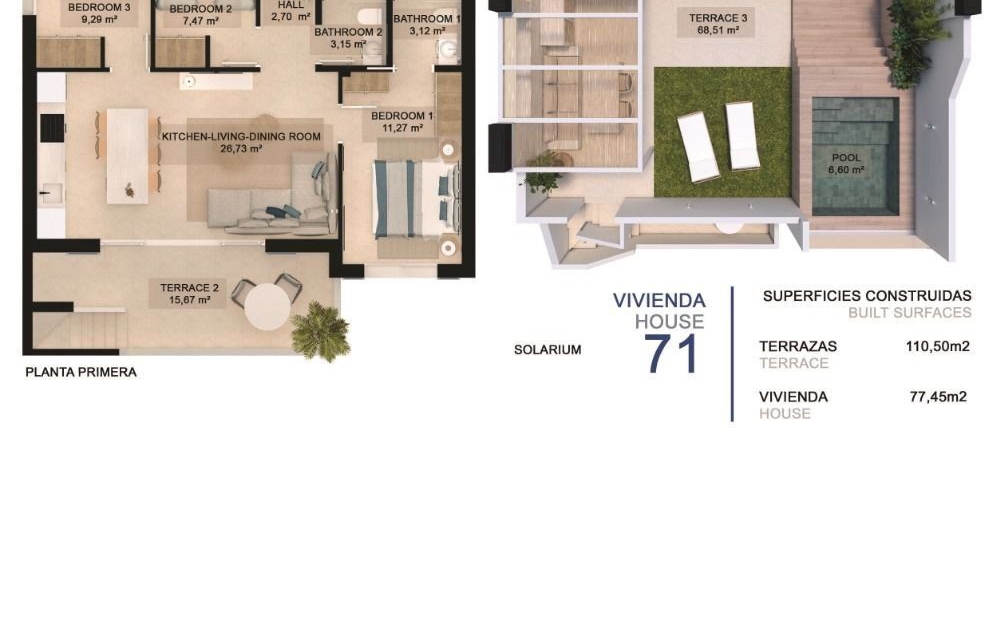 Alle eiendommene har 3 soverom, 2 bad, åpen kjøkkenløsning med stue, garderober og terrasse.