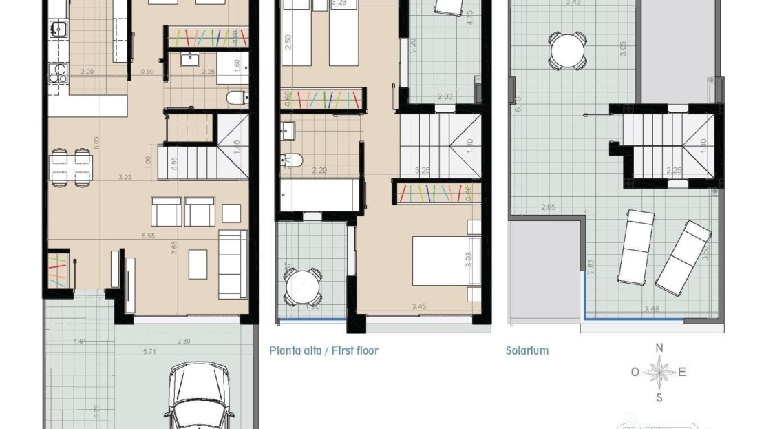 I tillegg har bungalowene og solariumene i første etasje dusjer med varmt og kaldt vann, mens alle boligene har et energieffektivt aerotermisk system for varmt vann.