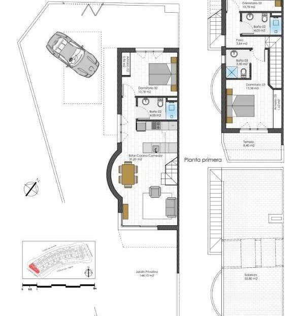 Bungalower i første etasje med privat hage og bungalower i toppetasjen med privat solarium.