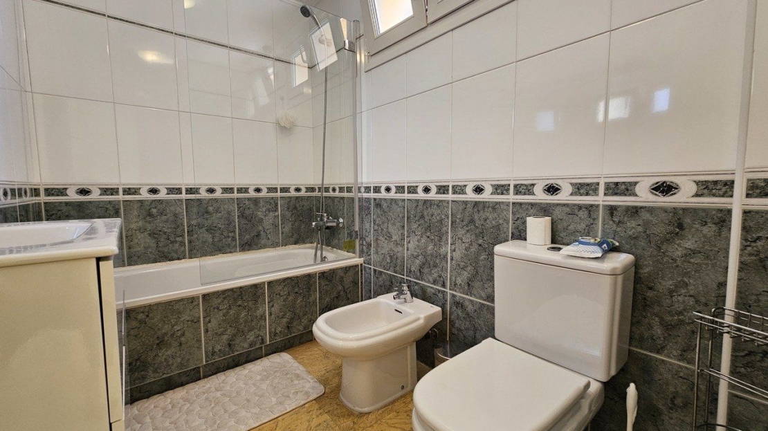 Rare opportunity to purchase this spectacular property in Calas de Campoamor with open sea views, just 100m from the beach. This 3 bedroom, 3 bathroom villa boasts a heated saline swimming pool installed less than 2 years ago along with a private solarium and underground garage and storage room. Located in a gated complex this property has been maintained to a very high standard with a sleek brand new kitchen and very attractive marble flooring throughout. On the ground floor there is fantastic living and dining room with floor to ceiling patio doors leading outside the the tiled terrace and swimming pool which has been finished with artificial grass. On the first floor you with find the master bedroom that enjoys sea views and en-suite bathroom along with two double guest bedrooms and the family bathroom all with views towards the sea or the communal swimming pool. On the top floor you will find the fabulous solarium with more stunning views of the Mediterranean and down towards the Mar Menor. The villa has an underground garage and storage accessed via an internal staircase, where you can conveniently access your car and exit the complex via electric doors. The house forms part of a well maintained complex where home owners also have use of the huge communal swimming pool and pretty garden. The property is sold as seen, fully furnished with many, many extras including independent laundry room, new air-conditioning units in the bedrooms, brand new kitchen appliances, non-chemical saline heated pool system, automated garage doors, intercom entry system, open fireplace in the living room and purpose built barbecue on the main terrace.Calas de Campoamor is a sought after location with all amenities within a few minutes walking distance including an international supermarket and bakery, 24hr pharmacy and medical centre along with a vast array of restaurants, cocktail and tapas bars.