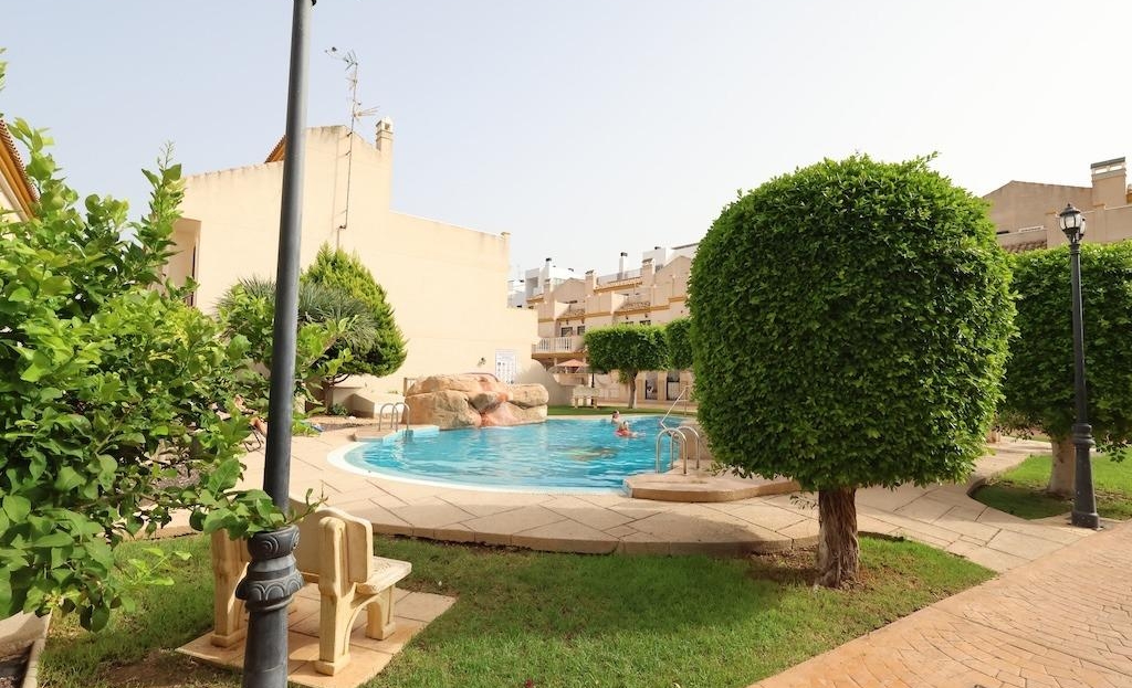 Semi-detached house in the exclusive Aldeas de Aguamarina residential area, located in Cabo Roig. The 72 m² home features 3 bedrooms, one of them on the ground floor, 2 full bathrooms, a spacious living-dining room, and a spacious separate kitchen with an open-plan utility room.. . It features two terraces, a 34 m² garden with a barbecue area, ideal for outdoor enjoyment, and a large sun terrace with sea views. It is sold semi-furnished and in good condition.. . The residential complex offers a beautiful communal pool and is located just steps from the sea and all amenities. Ideal as a permanent residence or as an investment for holiday rentals.