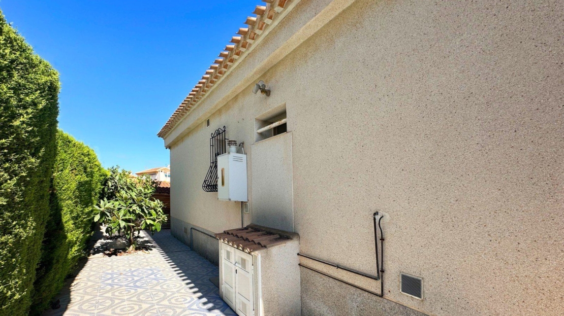 As soon as you step inside, you'll be welcomed by a bright and welcoming atmosphere thanks to its south/west orientation that allows natural light to flood every corner. The villa is conveniently located on one level and boasts three spacious double bedrooms, perfect for resting and relaxing, as well as two bathrooms with walk-in shower. The master suite with a wall-to-wall wardrobe and ensuite bathroom offers a touch of sophistication, including underfloor heating for extra comfort.