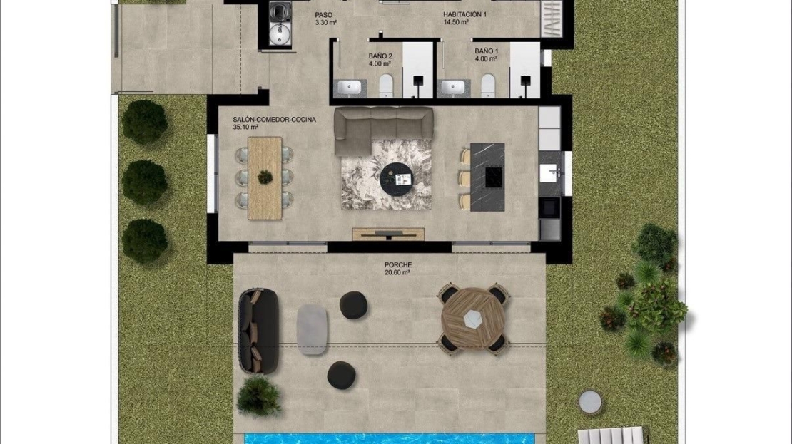 Dagområde: Her finner vi en romslig stue/spisestue med åpen kjøkkenløsning (kjøkkeninnredning inkludert) som er forbundet med den store, moderne verandaen gjennom to store vinduer, som gir tilgang til hagen og bassenget.