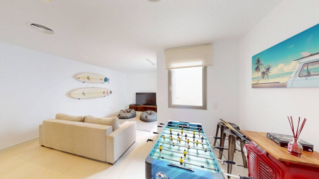 Uteområdene er ideelle for sosiale sammenkomster, med flere terrasser, grillplass, utedusj og et panoramisk solarium på taket med utsikt over golfbanen og havet.