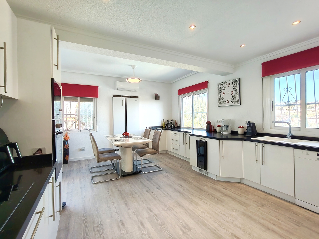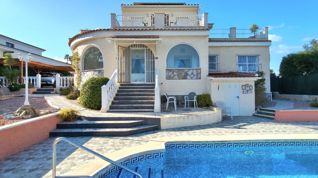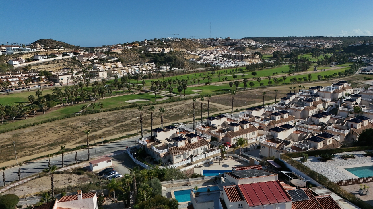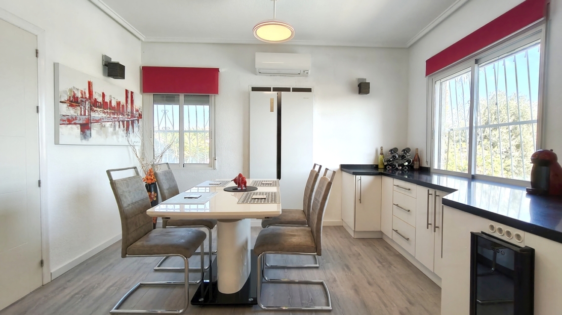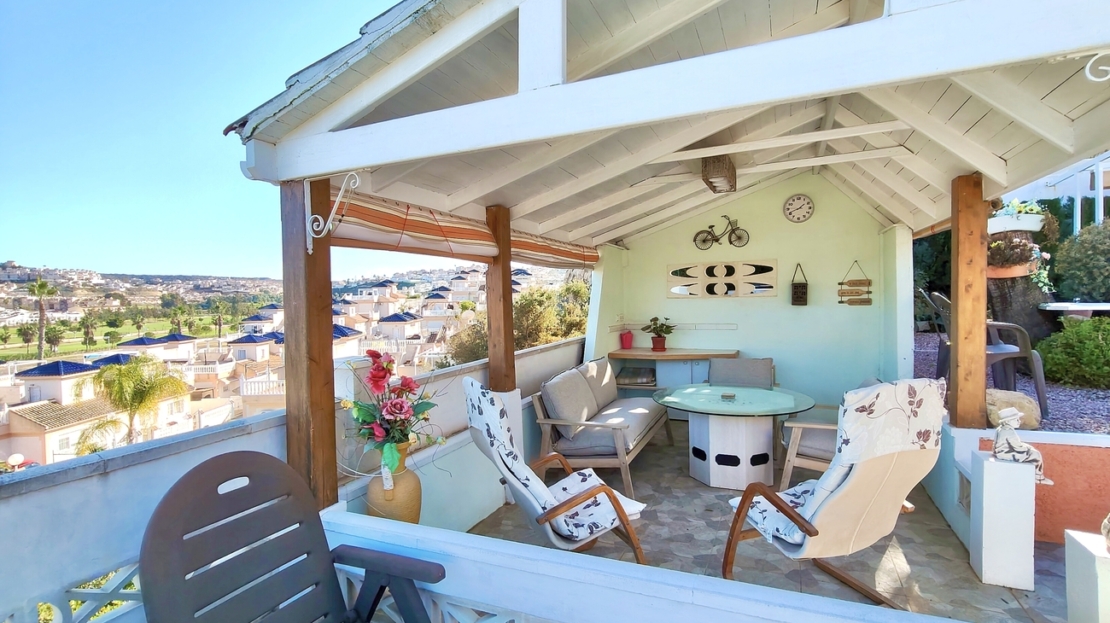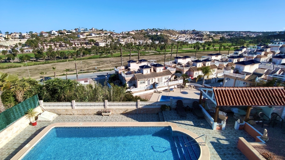This beautifully reformed south facing detached villa enjoys a prime frontline position overlooking La Marquesa Golf Course in Ciudad Quesada. Ideally located on the lower part of the golf resort, the property is within walking distance of shops, restaurants and everyday amenities, offering an excellent balance of privacy, views and convenience.Set on a generous plot of approximately 710 m², the villa benefits from open golf views and outstanding outdoor living areas. The exterior includes a private swimming pool, ornamental fish pond, several seating and dining terraces, a carport, storage rooms and a dedicated utility area, all designed to make the most of the Mediterranean climate.The main living level offers a bright and welcoming living room, an enclosed glass terrace with panoramic golf views, a modern separate kitchen with dining area, three spacious bedrooms and two bathrooms. The master bedroom features a walk in dressing room and an en suite bathroom, providing comfort and privacy.The upper level adds significant versatility, with a large room currently used as a snooker room, a WC, and access to a private terrace and solarium. This space is ideal for entertaining and could easily be converted into a fourth bedroom, guest suite or additional living area.Finished to a high standard and equipped with solar panels, the property is offered fully furnished subject to offer.An excellent opportunity to acquire a quality villa with private pool and golf course views in one of the most sought after areas of Ciudad Quesada, ideal as a permanent residence or a holiday home.